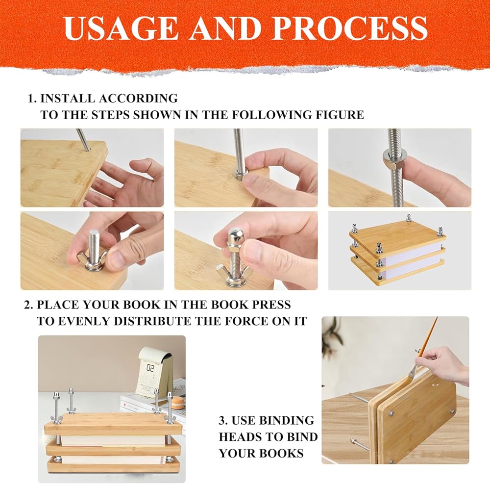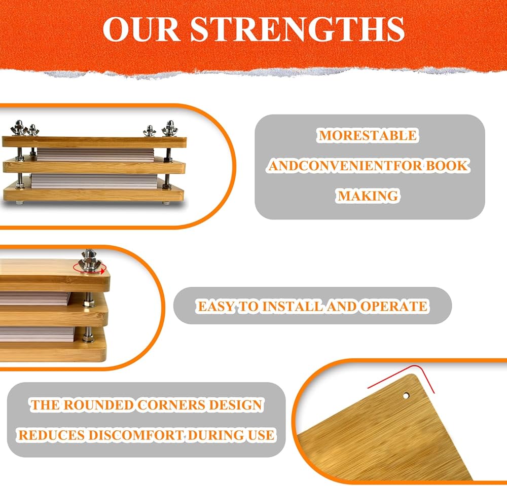 مواد عالية الجودة: ماكينة تجليد الكتب مصنوعة من خشب الخيزران عالي الجودة ومسامير معدنية. تتميز ألواح الخيزران الطبيعية بسطح أملس وخالي من الاختباء ومريحة في الاستخدام. قوي ومتين، وهذا يضمن ملمسًا ممتازًا وعمرًا طويلًا.