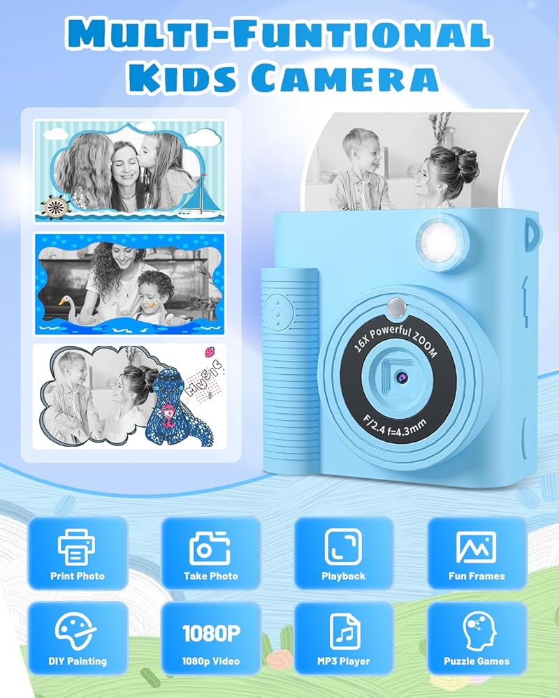 • 【كاميرا فورية متعددة الوظائف】مجهزة بشاشة IPS مقاس 2.4 بوصة، وكاميرا الطباعة الفورية للأطفال لا تسمح للأطفال فقط بالتقاط صور بدقة 24 ميجابكسل ومقاطع فيديو بدقة 1080 بكسل، والتشغيل، ولكن تحتوي أيضًا على مشغل موسيقى وألعاب وتأثيرات خاصة أخرى تجعل صورهم أكثر متعة. مضحكة ومثيرة. يمكن لكاميرا الطباعة الفورية للأطفال أن تلبي جميع احتياجاتك للترفيه وإطلاق العنان لإبداع الأطفال.