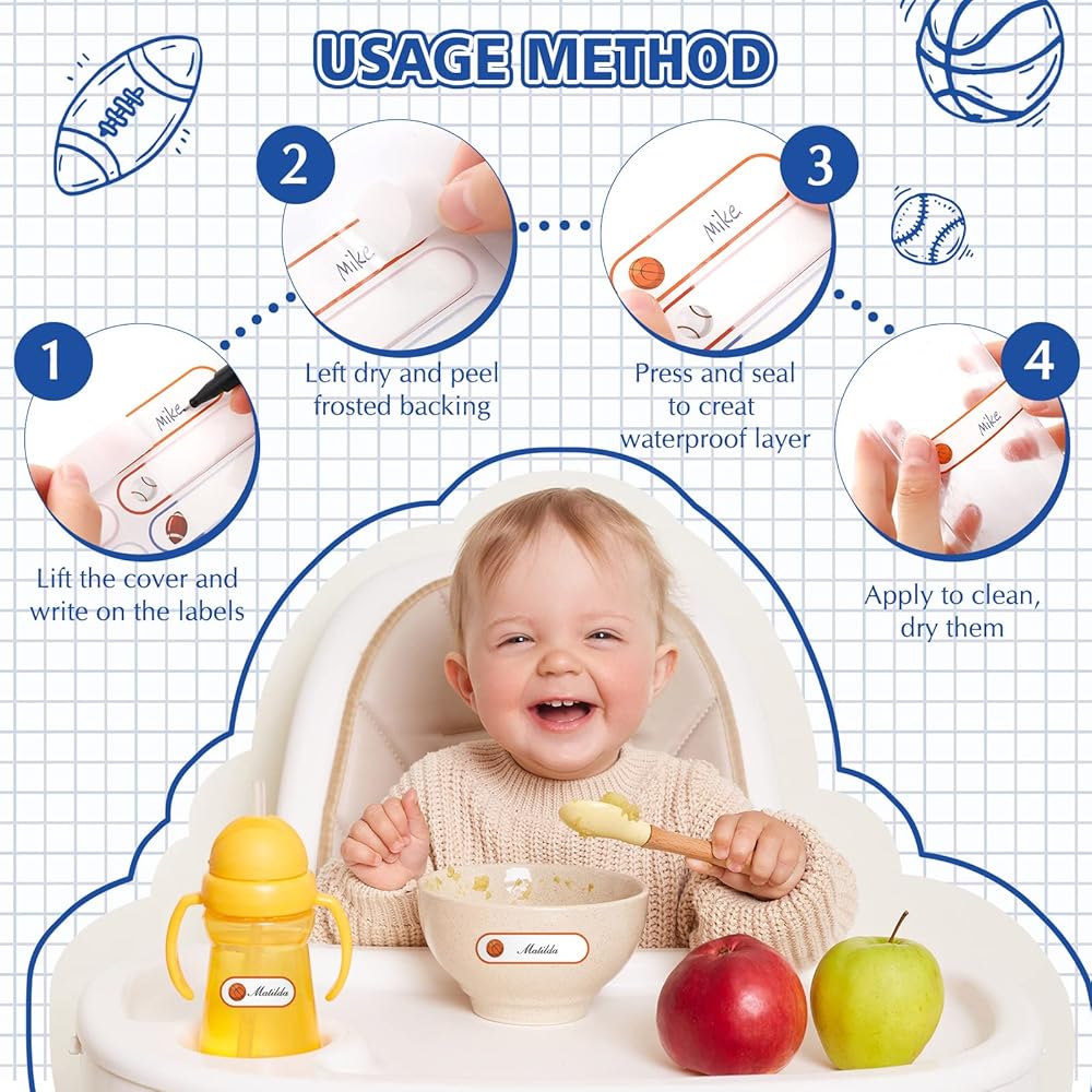 These water bottle name stickers are easy to use, just record your message with a ballpoint pen or marker, write the message on the daycare label and let dry for a few seconds. Peel off the frosted backing and press down on the clear cover plate to create a smooth waterproof seal. They are suitable for clean, dry items. Please note that the label will not stick to the silicone bottle.