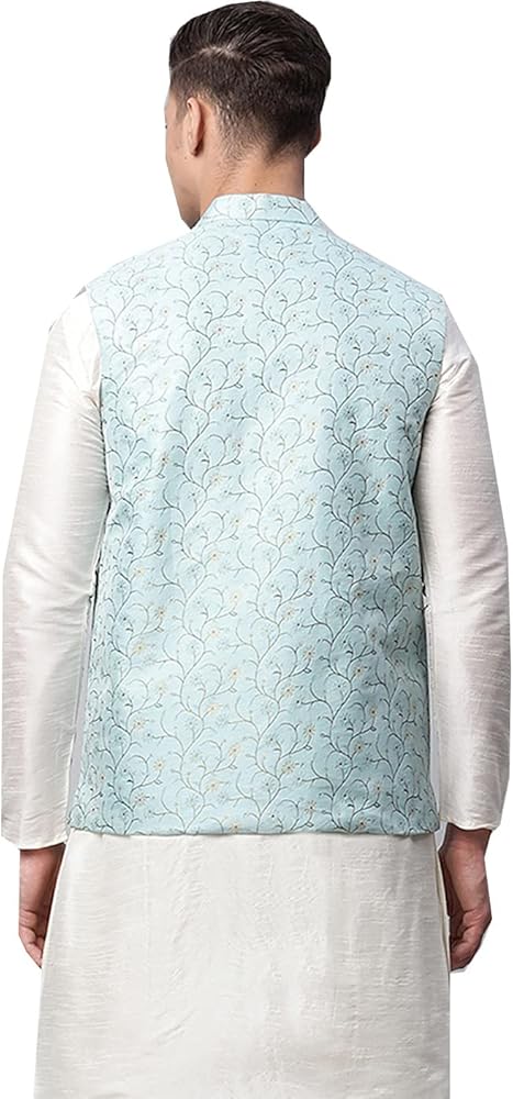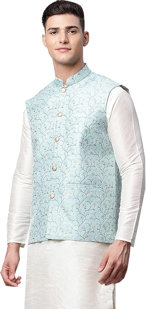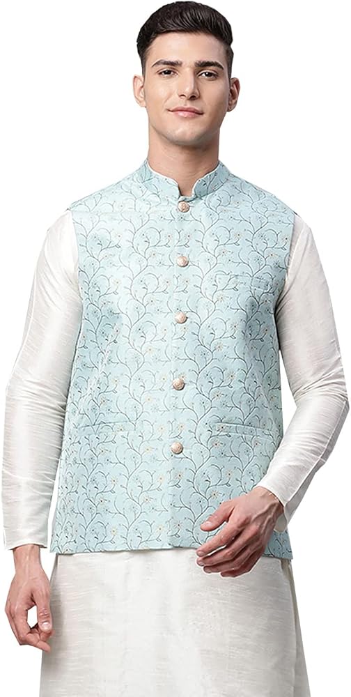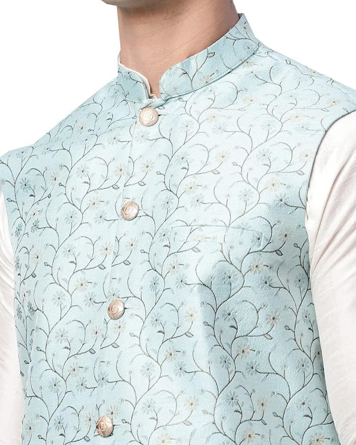 Elegant closed neck waistcoat button down also called self floral design Nehru jacket, Indian Vest or “Band Gale Ka Coat” made of Polyester fabric by the weavers of India. Excellent gift for men, suitable for formal and casual wear. Hand wash recommended. Highly comfortable and eminently suited to all climatic conditions, its use is widespread throughout the Indian subcontinent. These outerwear vest can be worn over kurtas or any shirt.
