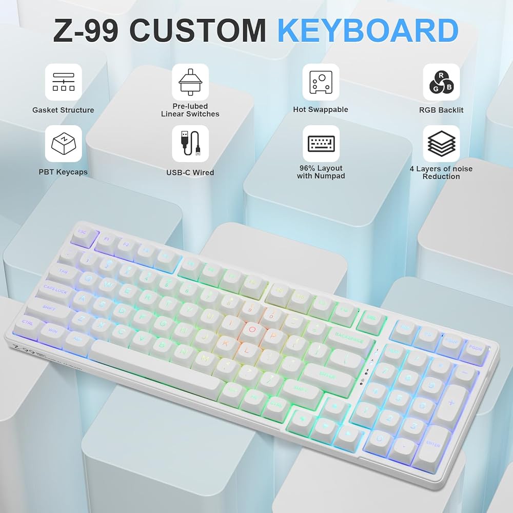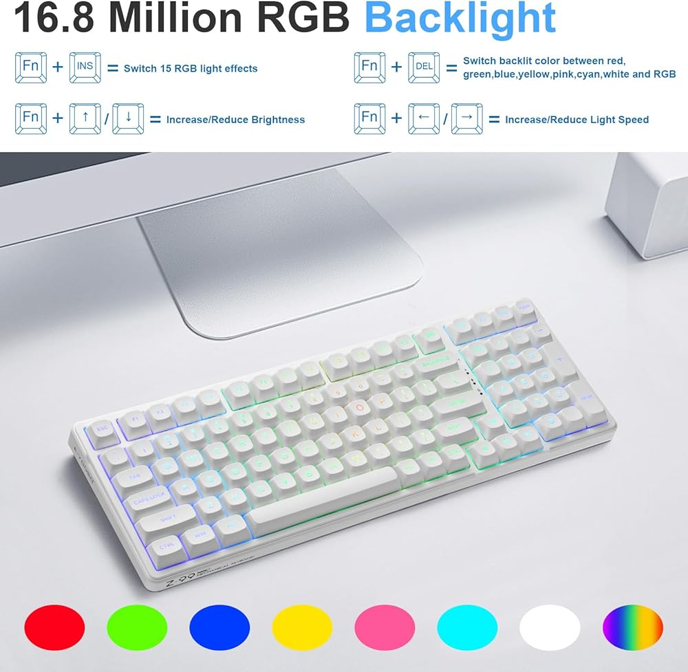 • 【لوحة المفاتيح Z-99 RGB تتضمن 15 مؤثرًا للإضاءة الخلفية و8 تبديل ألوان الإضاءة الخلفية الصلبة. يعمل إعداد RGB المختلف على إثراء وقت الكتابة. يمكن أيضًا تعديل سرعة ومستوى الإضاءة وفقًا لاحتياجاتك. أغطية مفاتيح PBT للحقن المزدوج، الشخصية لا تبهت أبدًا.