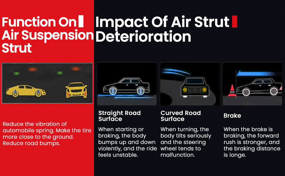 【ممتص للصدمات الهوائية】عندما تشعر بخلل واضح أثناء القيادة، أو أن سيارتك قد قادت أكثر من 80000 كم، للحصول على تجربة قيادة سلسة وآمنة، فمن الضروري استبدال حقيبة امتصاص الصدمات الخاصة بك في الوقت المناسب. يمكن لممتص الصدمات الهوائي Vigor أن يحل محل ممتص الصدمات الأصلي مباشرة.