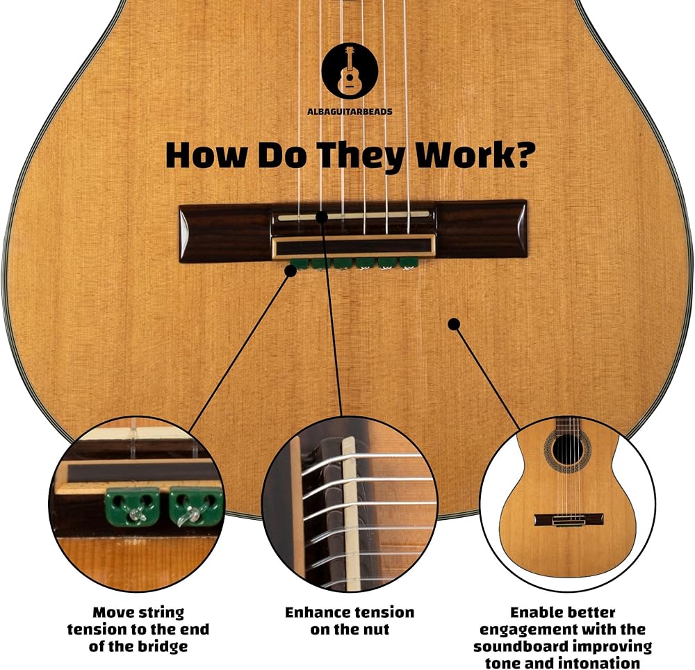 - تخلق الخرزات زاوية عميقة بين الجسر والصامولة وبالتالي تعزز التوتر على صامولة الجيتار