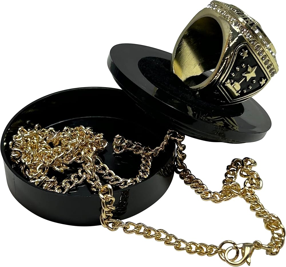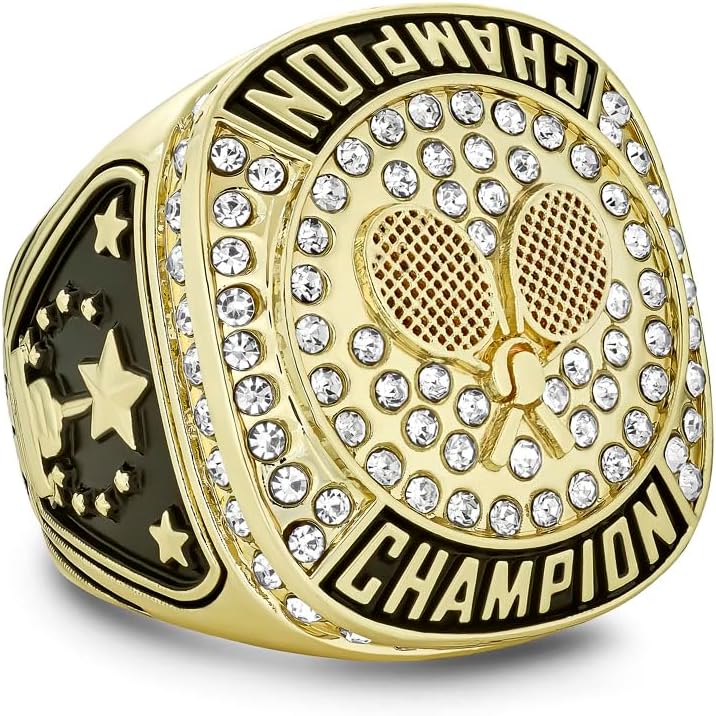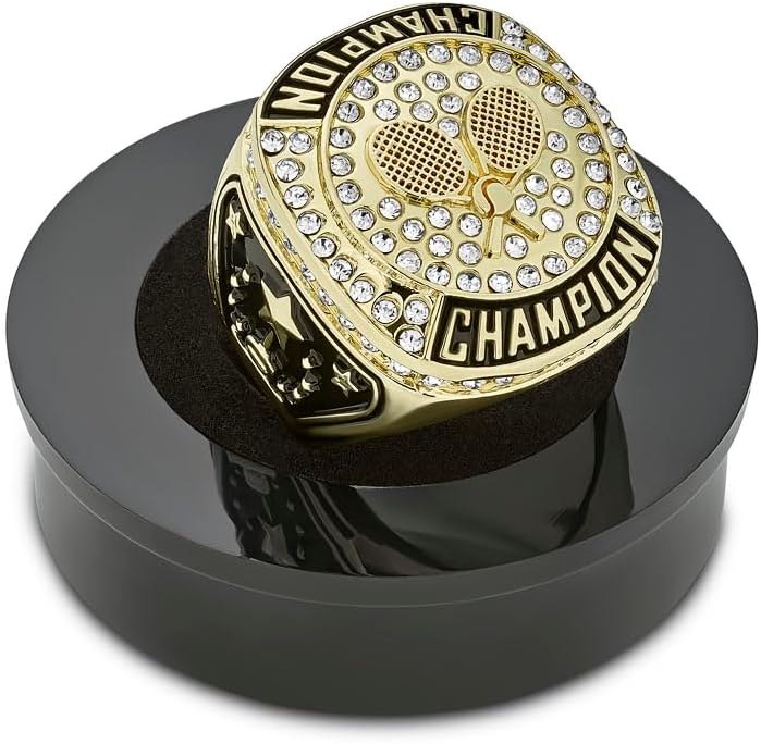 حلقات التنس Champion: تشتمل حلقات Champion الخاصة بنا على حامل/علبة عرض سوداء بقطر 2-1/2 بوصة (مفتوحة منبثقة) وسلسلة رقبة طويلة باللون الذهبي بطول 28 بوصة مما يمنحك عدة طرق مختلفة لعرض الجائزة بفخر.