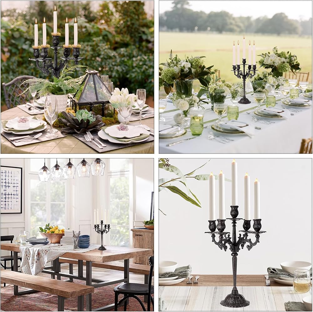 زخرفة لافتة للنظر: أكواب شموع رائعة على شكل زهرة وأنماط كلاسيكية على الدعامات المنحنية والجزء السفلي تجعل هذه الشمعدانات الكبيرة المصنوعة من الحديد الزهر ذات 5 أذرع تبدو أنيقة وعتيقة، وستضيف جوًا فاخرًا ونبيلًا إلى قطعة طاولتك المركزية.