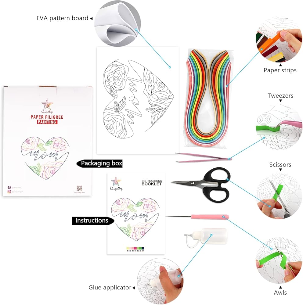 مجموعة أدوات كاملة: تحتوي حزمة أدوات اللف على لوحة نقش EVA، وشرائط ورقية، وأداة وضع الغراء، وملاقط، ومخرمات، ومقص، وتعليمات. دعونا نكون مبدعين مع مجموعة الرسم الورقية السهلة والاحترافية. (ملاحظة: هذه الحزمة لا تتضمن الغراء.)