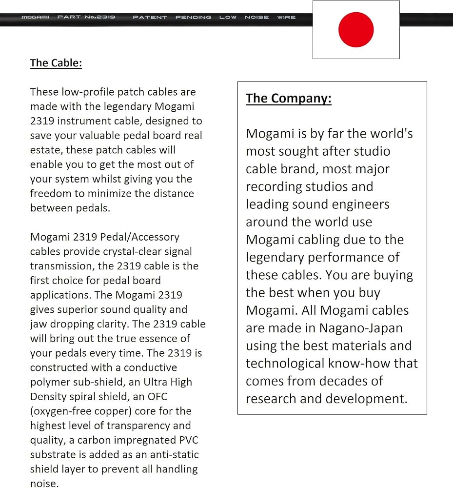 العلامة التجارية للأسلاك التي استخدمناها لتجميع الكابلات المخصصة هذه: Mogami، واحدة من أكثر العلامات التجارية المرغوبة لكابلات Pro، والتي تفضلها استوديوهات التسجيل الكبرى ومهندسي الصوت الرائدين حول العالم. يتم تصنيع جميع كابلات Mogami في ناغانو باليابان باستخدام أفضل المواد والخبرة التكنولوجية لعقود من البحث والتطوير.