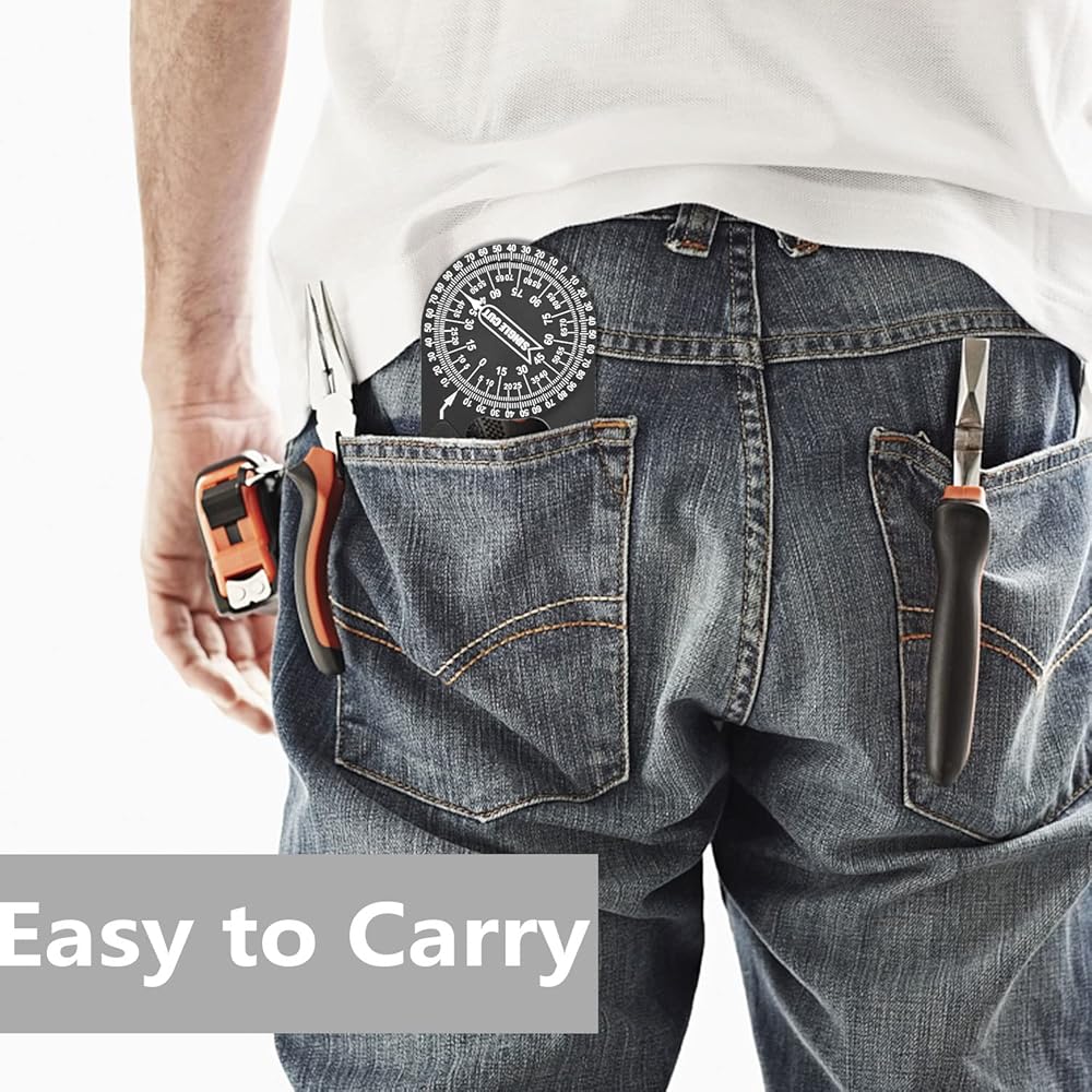 👍Design--The internal "O"-shaped mechanical rotation allows the protractor to rotate 360 degrees during operation, which is convenient for adjusting and capturing angle measurement. The 1/4 inch thick aluminum alloy is stronger, not like plastic, and has good corrosion resistance and wear resistance, ensuring stable and accurate readings of the inner/outer angle.