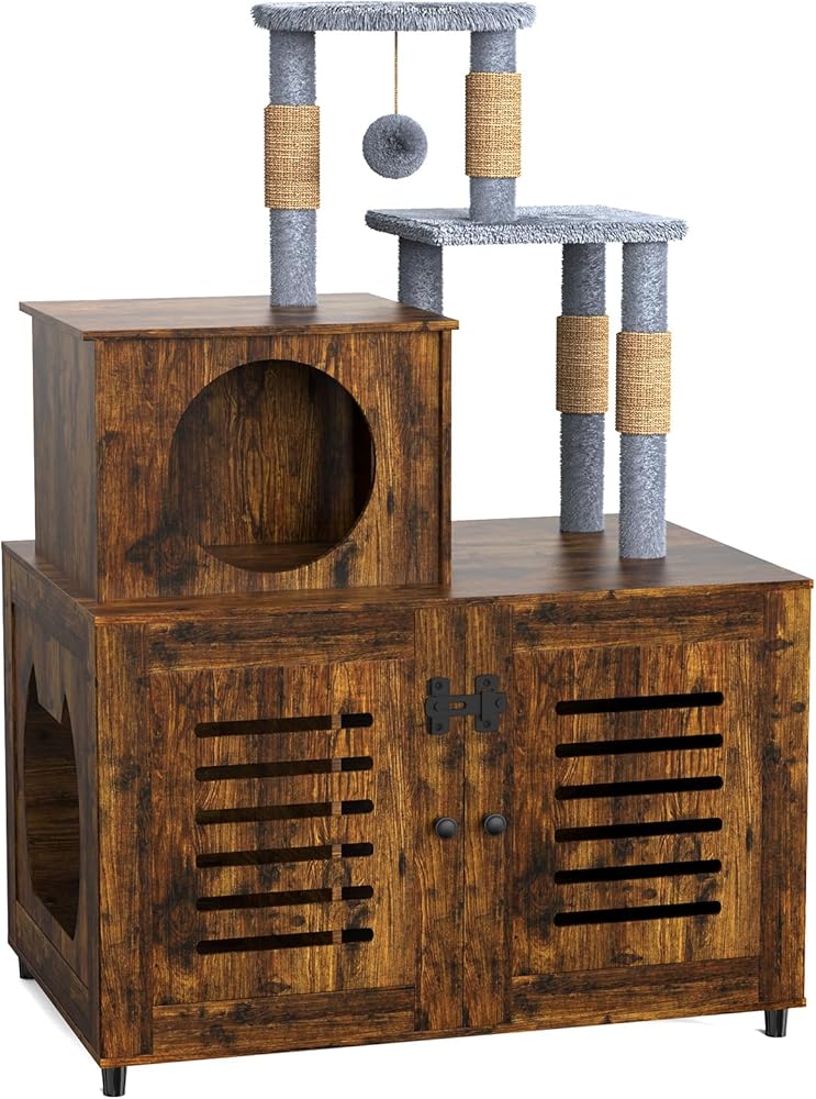 • 【حاوية صندوق الفضلات مع شجرة القطط】أثاث صندوق فضلات واسع مع عمود خدش للقطط، وأسرة، وكهف للقطط، وألعاب كرات من الفرو. كما يوفر أثاث القطط لقطتك مساحة للاسترخاء والترفيه في الأعلى مع توفير مساحة أكبر لمنزلك.