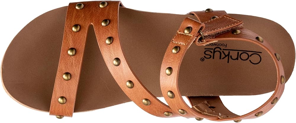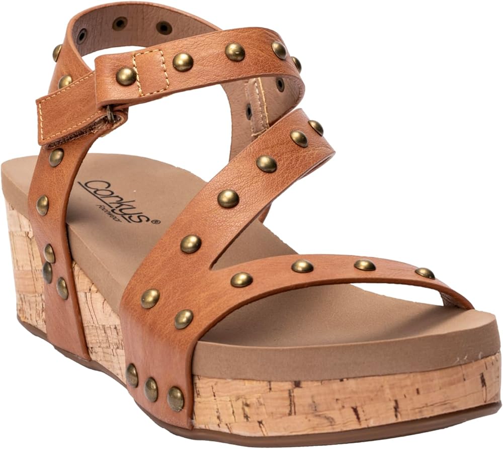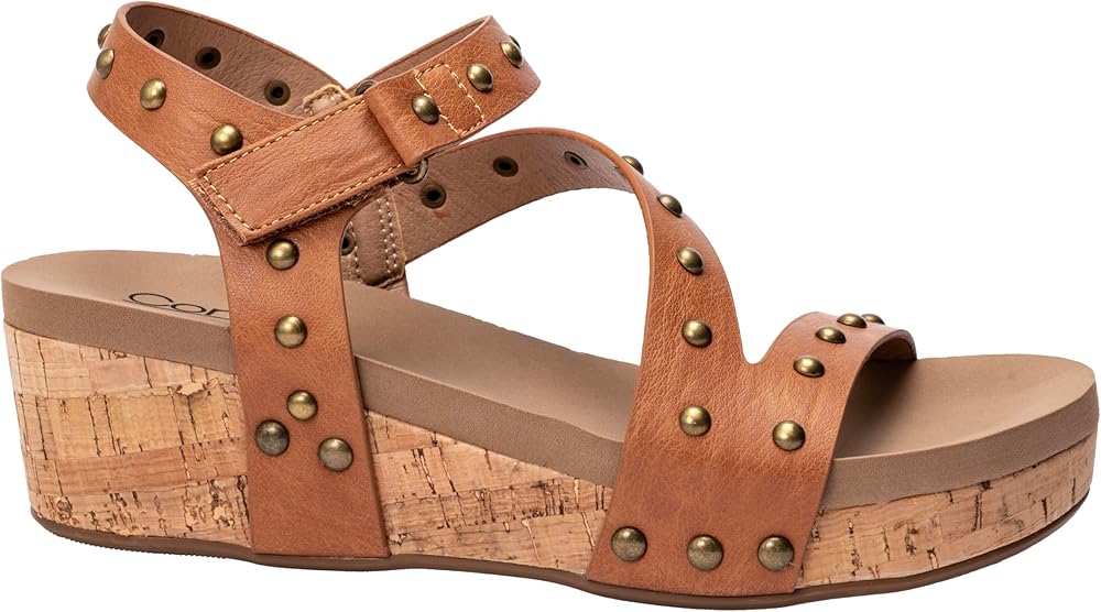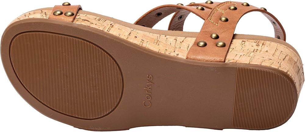 *Platform sandal from Corkys *Strappy synthetic upper with studs *Hook-and-loop closure *Lightly cushioned footbed *2-1/2" wedge heel