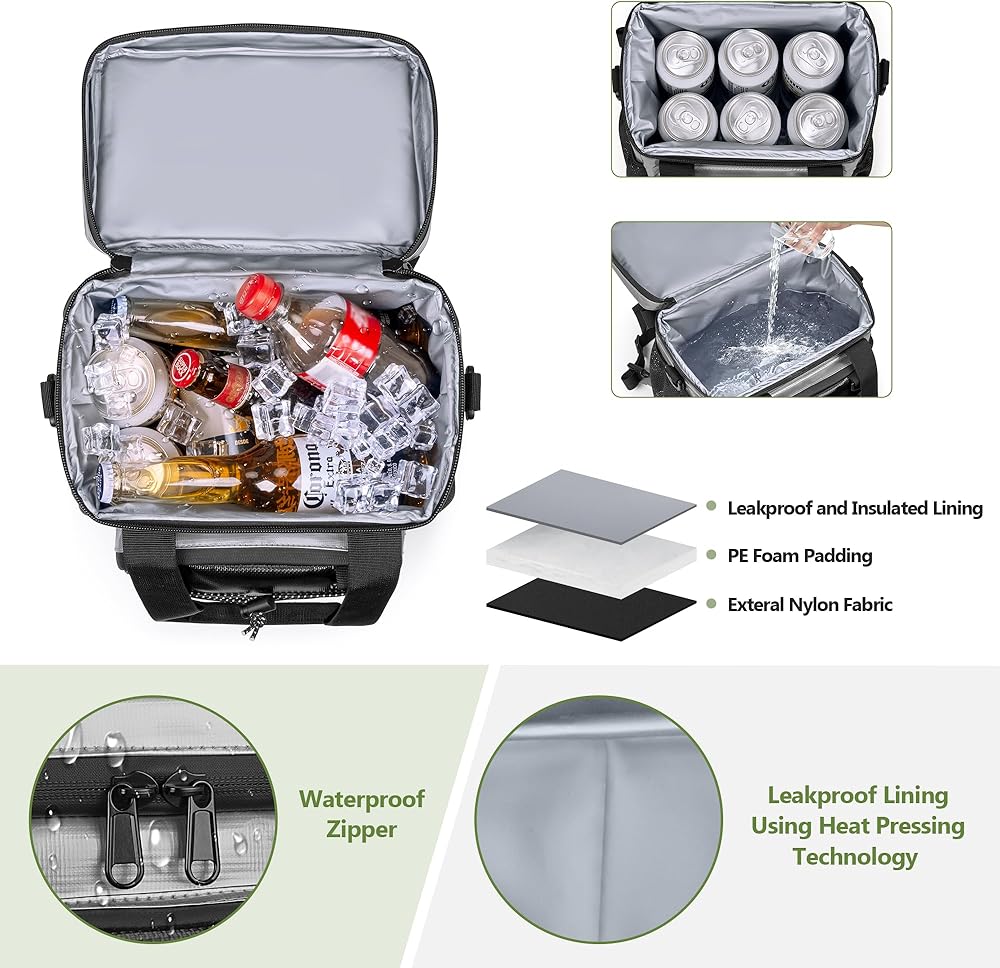 • معزولة ومانعة للتسرب: حجرة التبريد مجهزة ببطانة قطنية 8 مم وتعتمد عملية الضغط الساخن من مادة PEVA بالإضافة إلى سحابات مقاومة للماء. أضف الثلج أو أكياس الثلج إليه والتي يمكن أن تحافظ على برودة مشروباتك لمدة 12 ساعة.