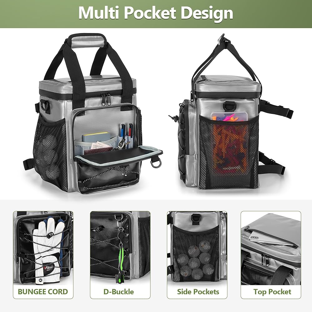 • تخزين واسع: توفر حقيبة تبريد عربة الجولف 4 جيوب، وجيب أمامي كبير لحقيبتك، والنظارات، وجيبين جانبيين للوجبات الخفيفة والكرات والمناشف وجيب صغير علوي للمفاتيح والهاتف الخلوي. بالإضافة إلى ذلك، يمكن للحبال المطاطية الأمامية تعليق القفازات، ويمكن للحلقة من النوع D تعليق فرشاة نادي الجولف.
