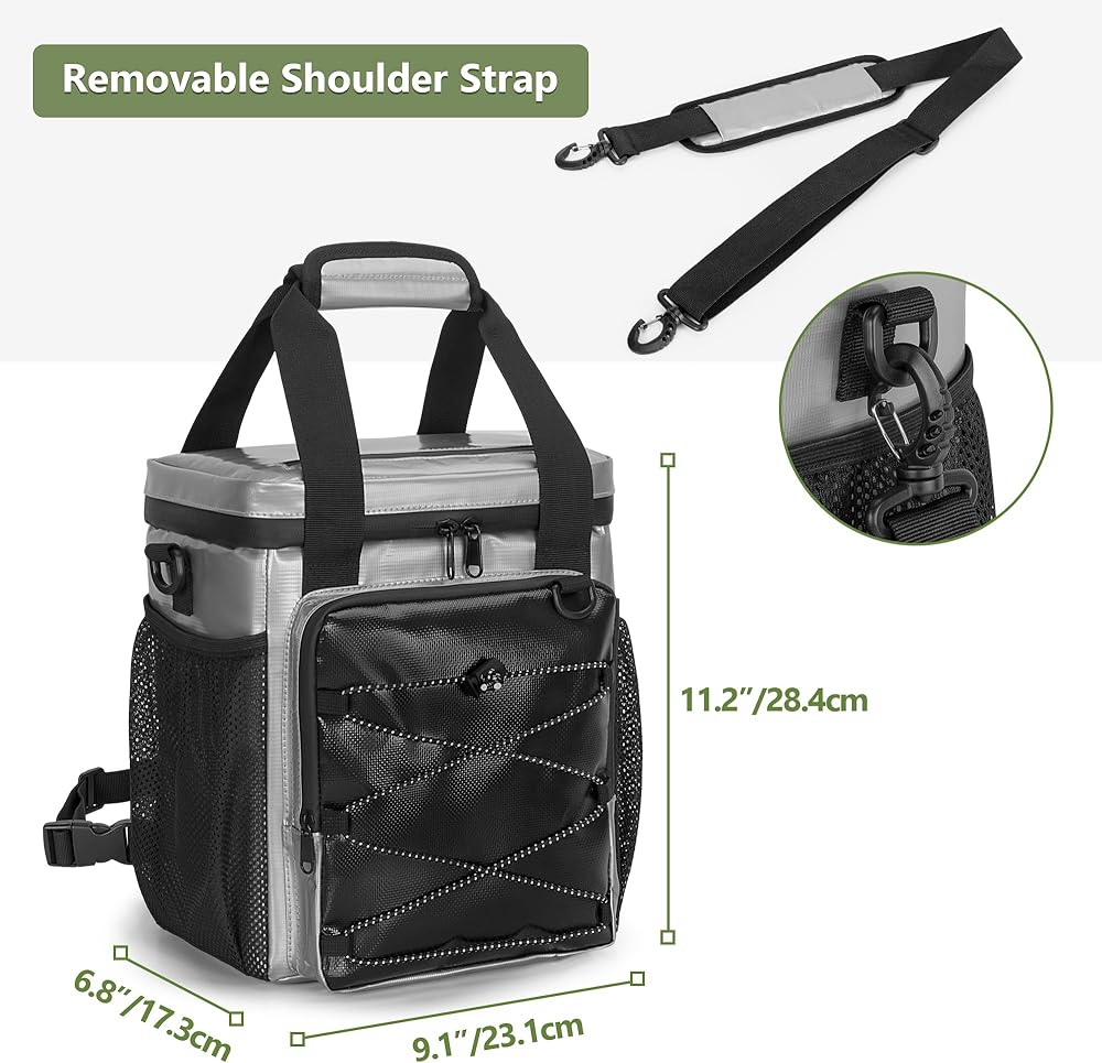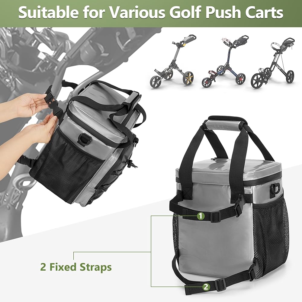 • سهل الحمل: يحتوي مبرد عربة الجولف الخاص بنا على شريطين خلفيين لربطهما بعربة الجولف الخاصة بك، مما يجعل من السهل تثبيته وخلعه. بالإضافة إلى ذلك، تأتي الحقيبة مع أحزمة يد مبطنة وحزام كتف لطريقتين للحمل.