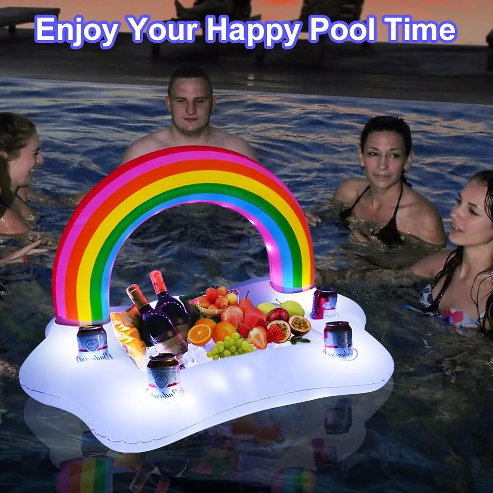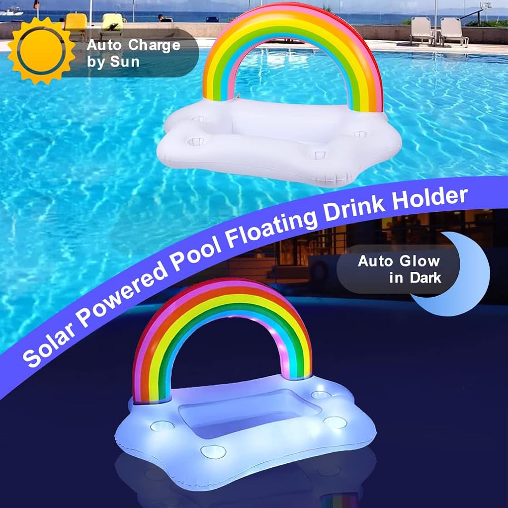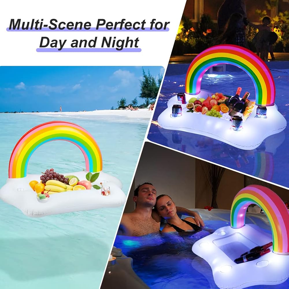 حامل مشروبات على شكل سحابة قوس قزح قابل للنفخ من فيرست إي مع أضواء شمسية، حاملات أكواب حمام سباحة عائمة لحوض الاستحمام الساخن، ضوء LED يتوهج في عوامات مشروبات حمام السباحة الداكنة، ملحق بار تبريد عائم لمتعة مياه حمام السباحة