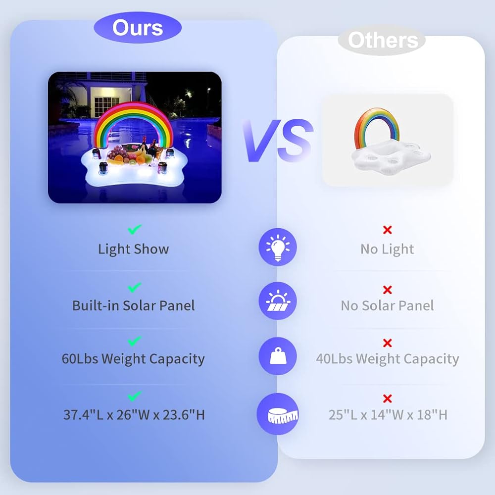 🌈 【مصباح يطفو على حمام السباحة يعمل بالطاقة الشمسية】يتم شحن المبرد العائم بالطاقة الشمسية، وسيتم شحنه تلقائيًا عند وضعه في الفناء أو حمام السباحة أو الحديقة خلال النهار، بمجرد حلول الظلام، ستضيء سحابة قوس قزح تلقائيًا، سوف يلمع الضوء الجميل ويضيء حمام السباحة الخاص بك، ويمكن أن يتوهج حامل مشروبات حمام السباحة لمدة تصل إلى 6-8 ساعات عند الشحن الكامل. حامل المشروبات العائم القابل للنفخ هو رفيق أساسي لحمام السباحة الصيفي الخاص بك.
