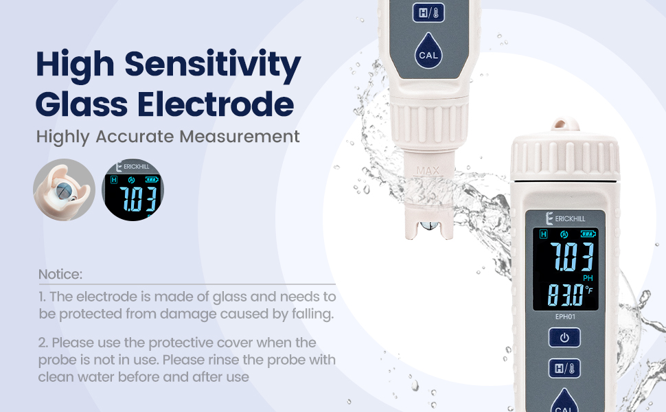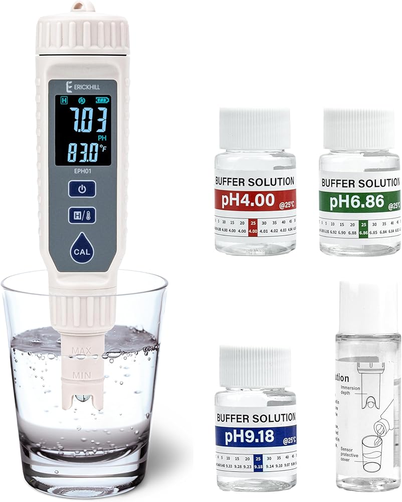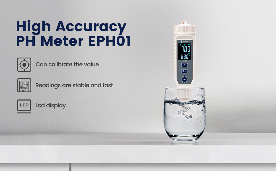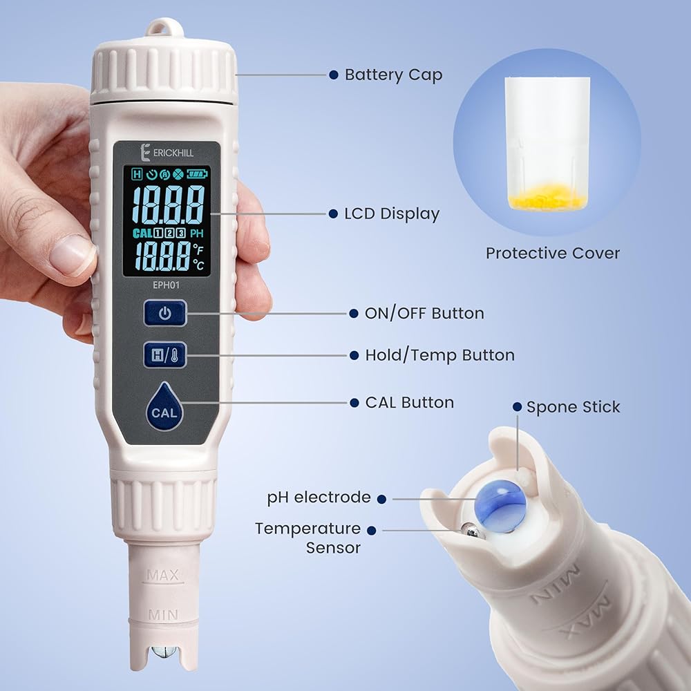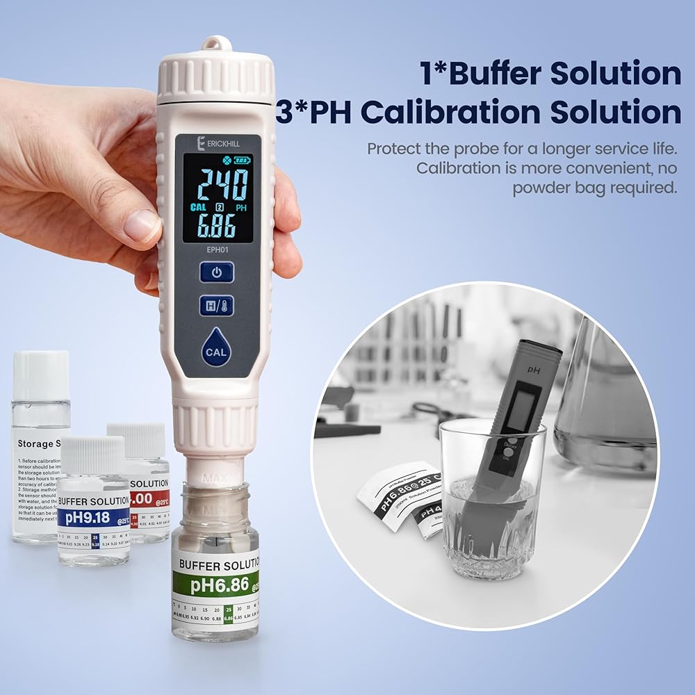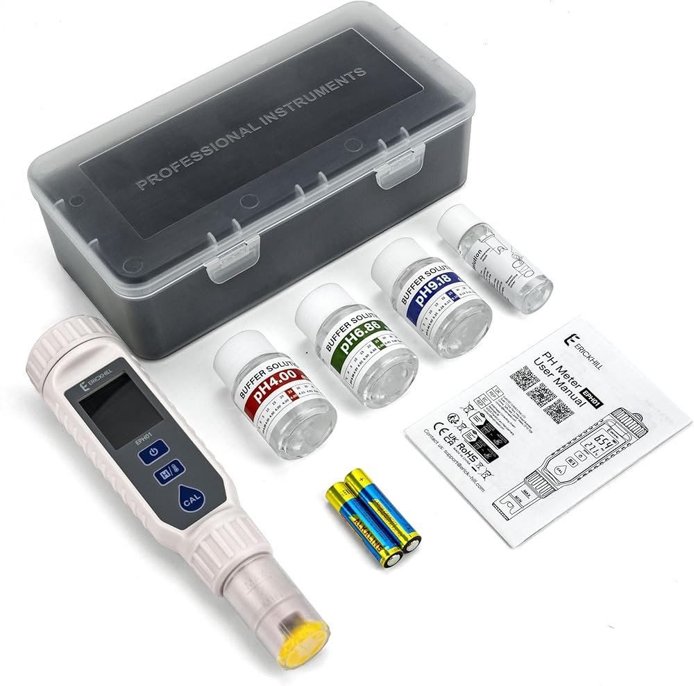 【خدمة العملاء】تحتوي العبوة على 1* مقياس درجة الحموضة الرقمي EPH01، 1*محلول عازل، 3*حل معايرة، 1*دليل تعليمات، 2*1.5 فولت بطاريات AAA. تقدم ERICKHILL ضمانًا لمدة 3 سنوات ودعمًا فنيًا مدى الحياة لكل منتج. إذا كان لديك أي أسئلة فلا تتردد في استشارة لنا