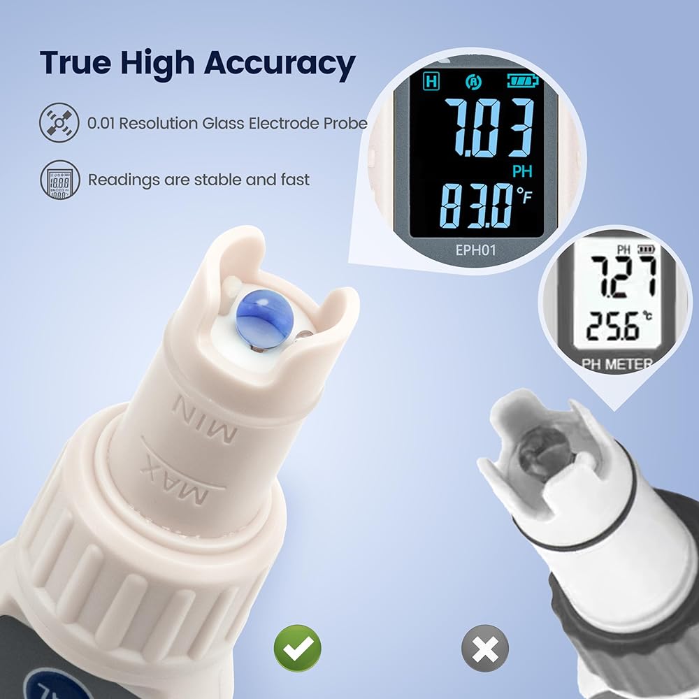 دقة عالية: تم تجهيز جهاز اختبار الأس الهيدروجيني الرقمي EPH01 بمسبار زجاجي عالي الحساسية ويسمح لك بقياس السوائل في نطاق 0-14 درجة حموضة، وتصل دقة الأس الهيدروجيني إلى 0.01، وقيمة الخطأ هي ±0.1 فقط. يحتوي مقياس الرقم الهيدروجيني للزراعة المائية المائية على وظيفة تعويض درجة الحرارة التلقائية (ATC)، والتي يمكنها تحديد قيمة الرقم الهيدروجيني للعينة بدقة في نطاق 0 درجة مئوية إلى 60 درجة مئوية (32 درجة فهرنهايت-140 درجة فهرنهايت) ( الماء المقطر واختبار قيمة الرقم الهيدروجيني للتربة غير متضمنة)