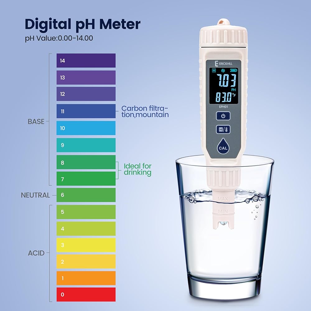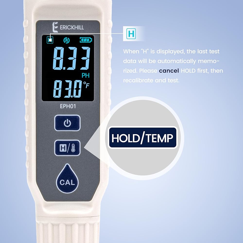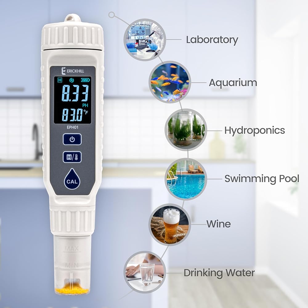 مقياس درجة الحموضة من ERICKHILL، جهاز اختبار درجة الحموضة عالي الدقة ±0.01 مع محلول معايرة ونطاق قياس 0-14 درجة حموضة، قلم درجة حموضة مقاوم للماء مع إضاءة خلفية ATC وLCD لمياه الشرب وحوض السمك والنبيذ وحمام السباحة والزراعة المائية