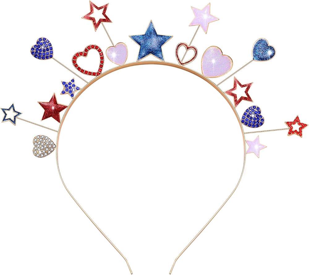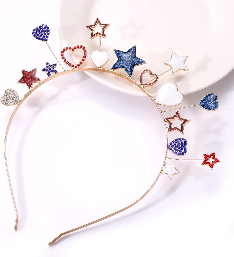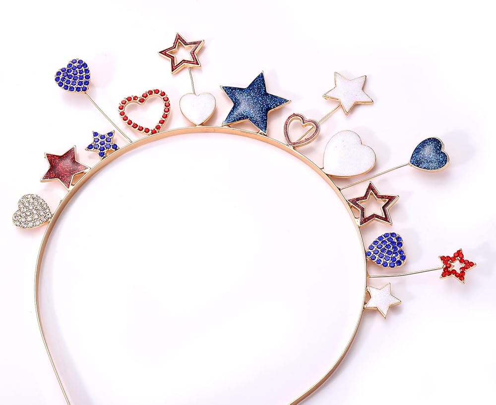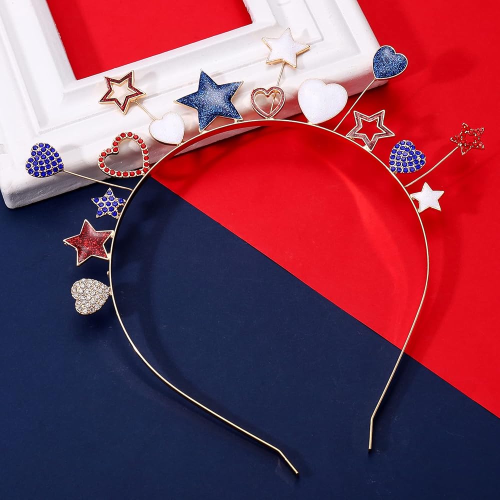 UNIQUE DESIGN - Get your hands up 'cause it's a party in the USA! A summer-ready headband, featuring a red, white, and blue stars hearts accent with rhinestones and a metallic band. Classic element, shiny and vibrant color, very much in line with Independence day, memorial day event ,add strong festive atmosphere.