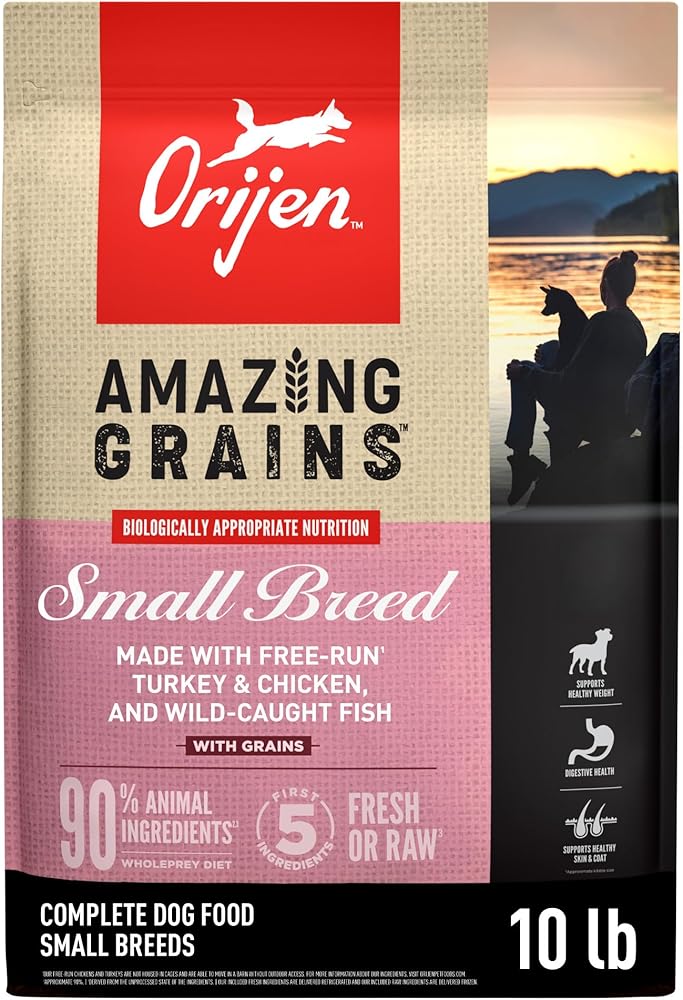 ORIJEN AMAZING GRAINS™ Small Breed dry dog food is packed with fresh or raw animal protein and enhanced with grains to give your dog peak nourishment. With 90%* premium animal ingredients, ORIJEN AMAZING GRAINS™ Small Breed kibble includes WholePrey ingredients from free-run** turkey and chicken, and wild-caught fish. The nutrient-dense animal ingredients in this kibble provides your small breed dog with the protein, vitamins and minerals they need to thrive. This ORIJEN™ dry dog food also includes a high-quality blend of oats, quinoa and chia, hand-selected to provide a balanced fiber ratio that helps support your small breed dog's digestive health. This unique diet also features a smaller kibble size! Nourish your small breed dog completely with the amazing animal protein and quality grains found in ORIJEN AMAZING GRAINS™. *Approximate and derived from the unprocessed state of the ingredients. **Our free-run chickens and turkeys are not housed in cages and are able to move in a barn without outdoor access. Our fresh ingredients use refrigeration as the sole method of preservation and our raw ingredients are frozen at their peak freshness.