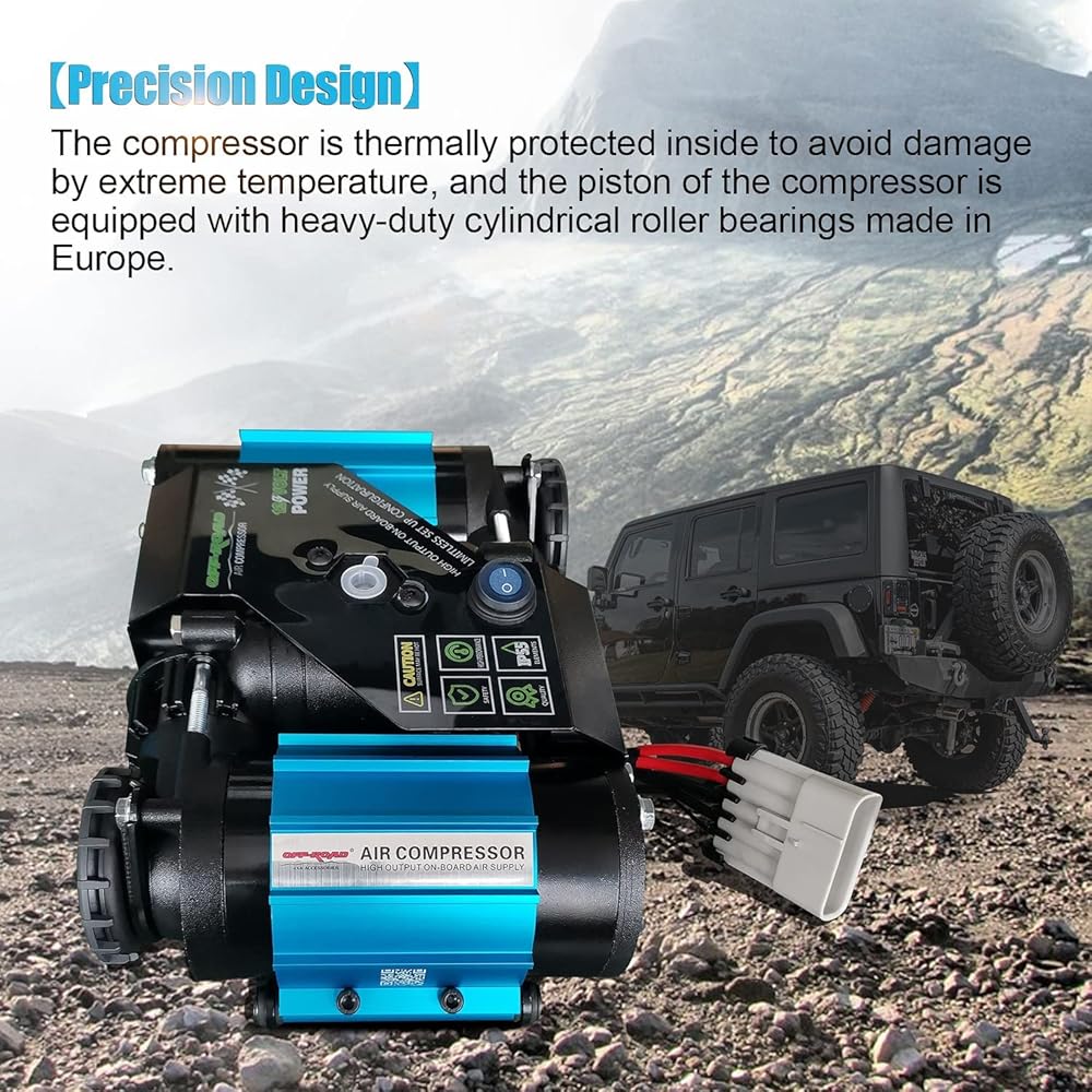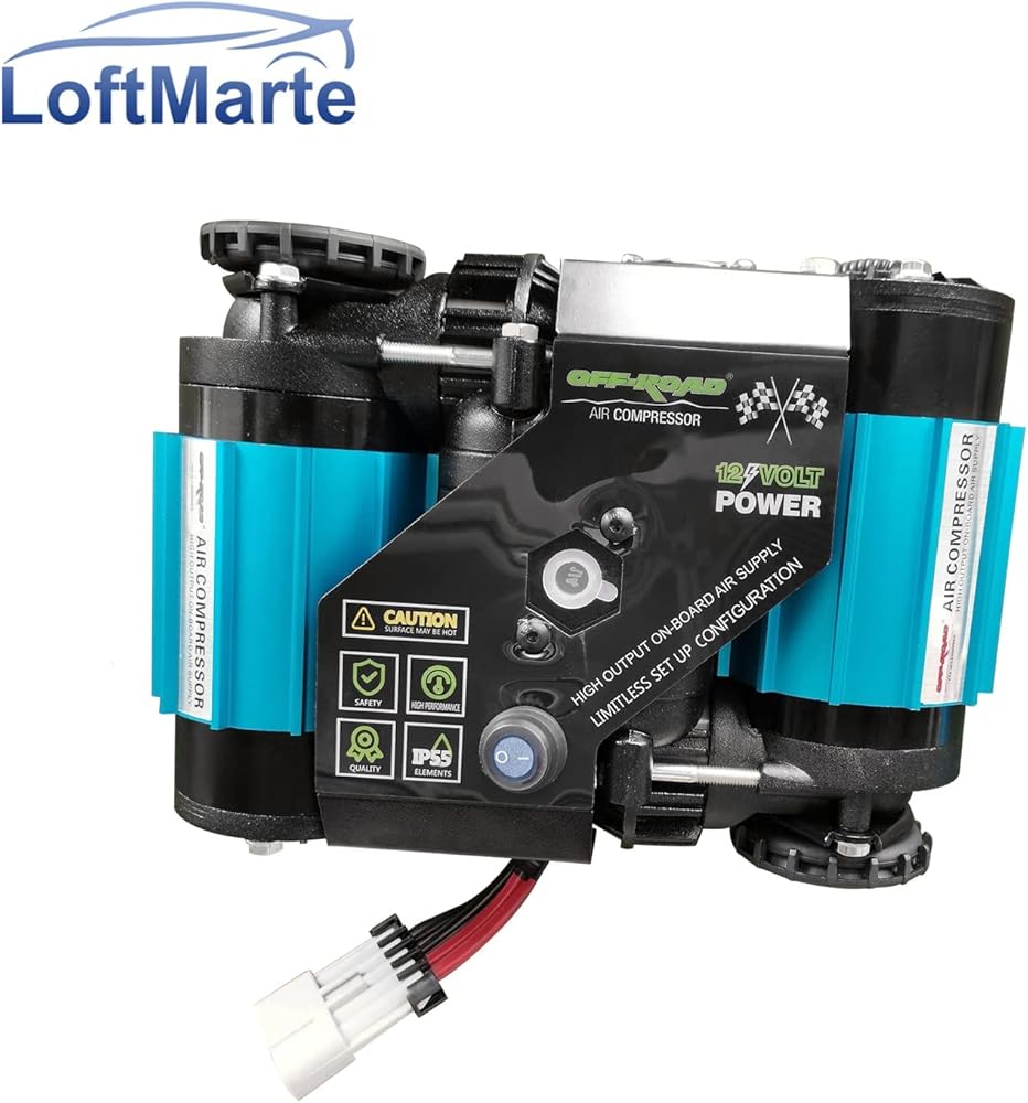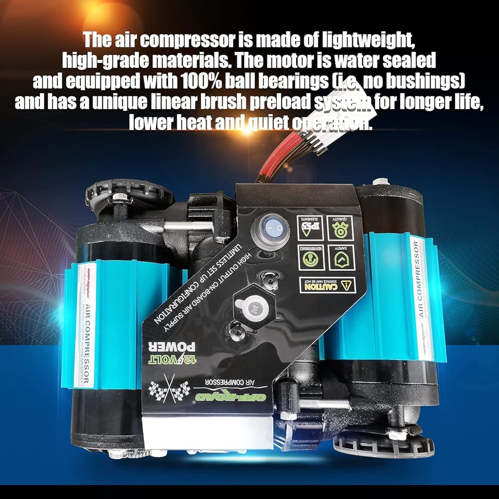 【أداء عالي】ضاغط هواء مزدوج عالي الإخراج 12 فولت مصنوع من مواد خفيفة الوزن وعالية الجودة. المحرك محكم الغلق ومجهز بمحامل كروية بنسبة 100% (أي بدون بطانات)، ويحتوي على نظام تحميل مسبق فريد للفرشاة الخطية يمكنه تحقيق عمر أطول، حرارة أقل وتشغيل هادئ.