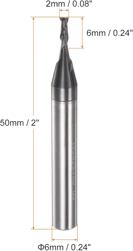 الحجم - قطر القطع: 5.5 ملم / 0.22 بوصة؛ طول فلوت القطع: 13 ملم / 0.51 بوصة؛ قطر الساق: 6 مم / 0.24 بوصة؛ الطول الإجمالي: 50 مم / 2 بوصة؛ صلابة القطع: HRC55؛ عدد المزامير: 2 مزامير