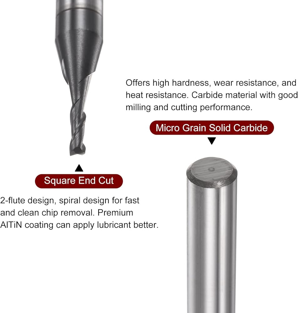الميزة - قطع نهاية مربعة، تصميم ثنائي الفلوت، تصميم مساحة رقاقة حلزونية لإزالة الرقائق بسرعة ونظيفة. يمكن للطلاء المركب Premium AlTiN (الألمنيوم العالي والتيتانيوم) أن يزيد من الصلابة ومقاومة التآكل، كما أنه يستخدم مواد التشحيم بشكل أفضل من أجل طحن أكثر سلاسة وعمر خدمة أطول.
