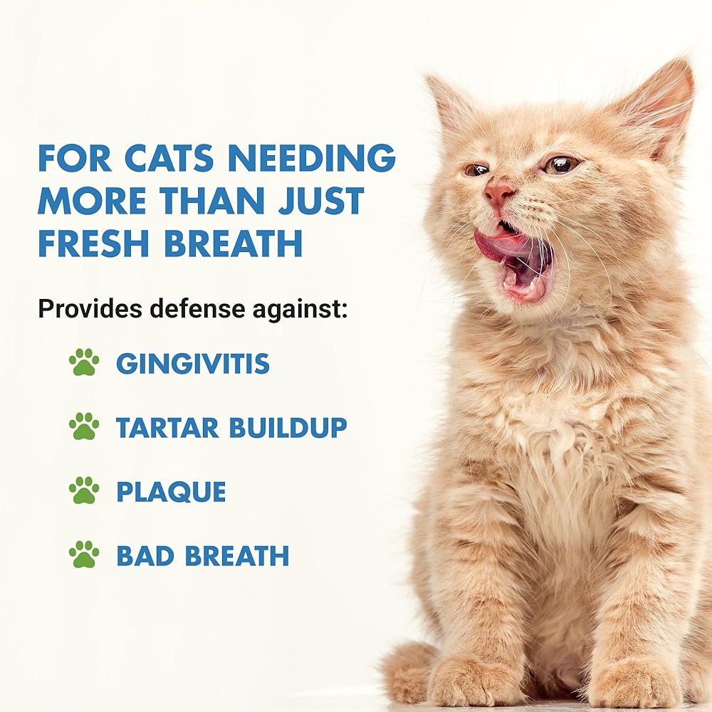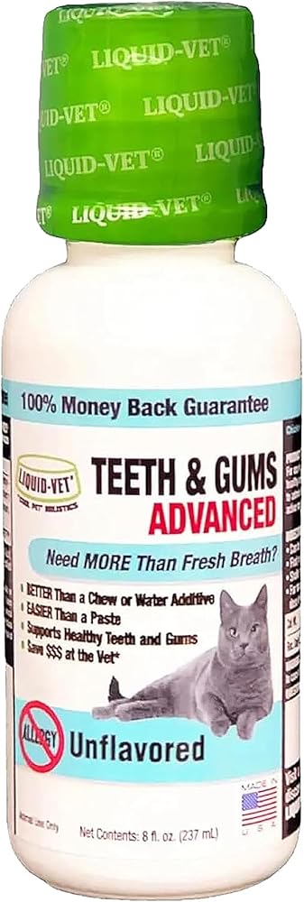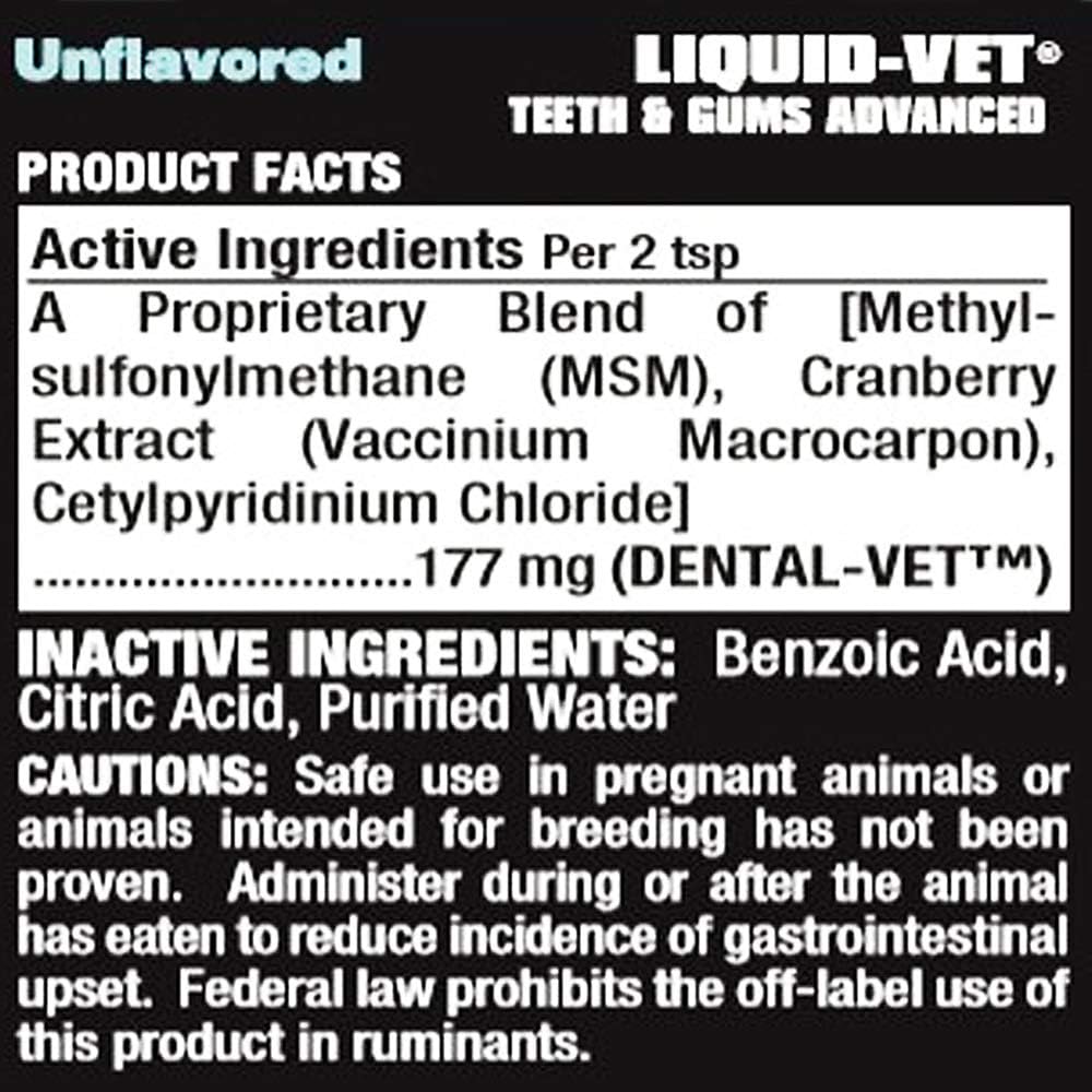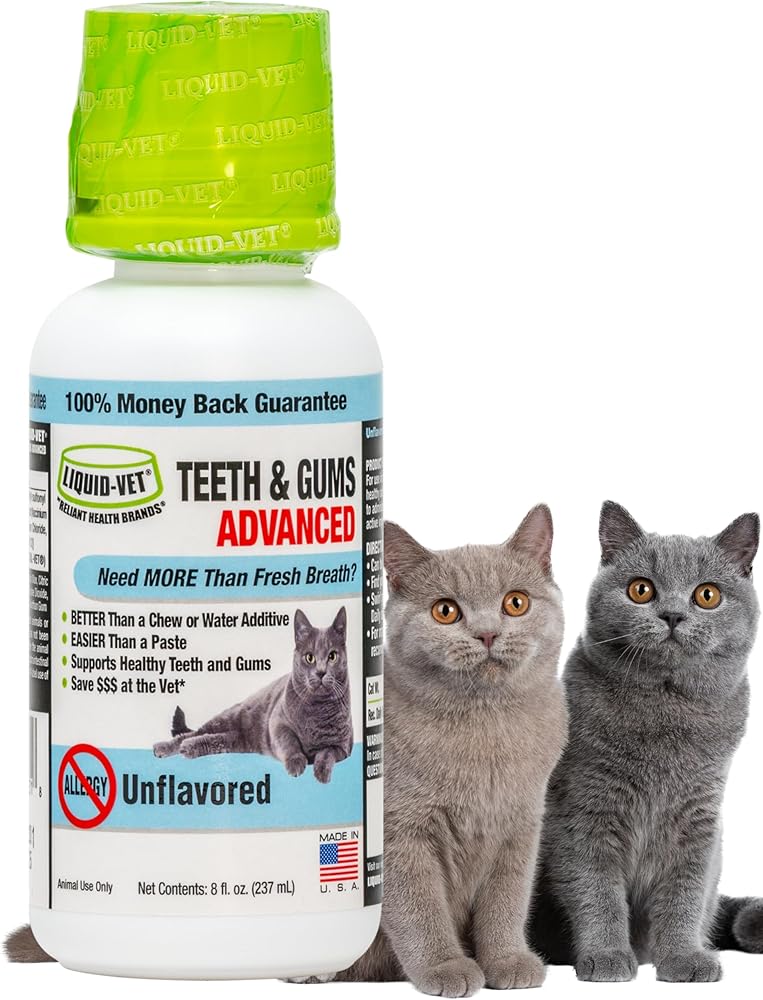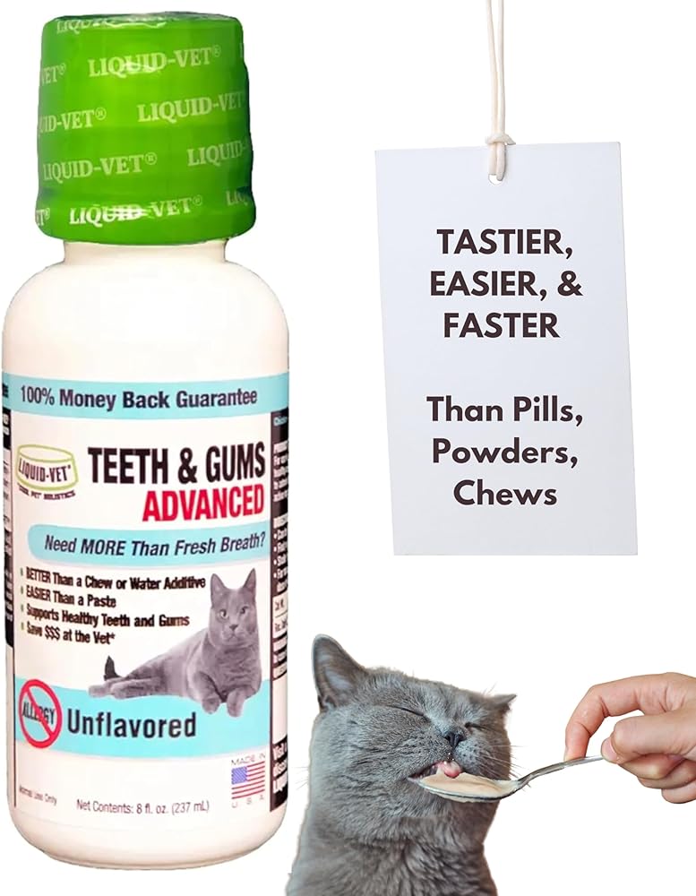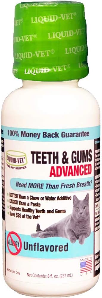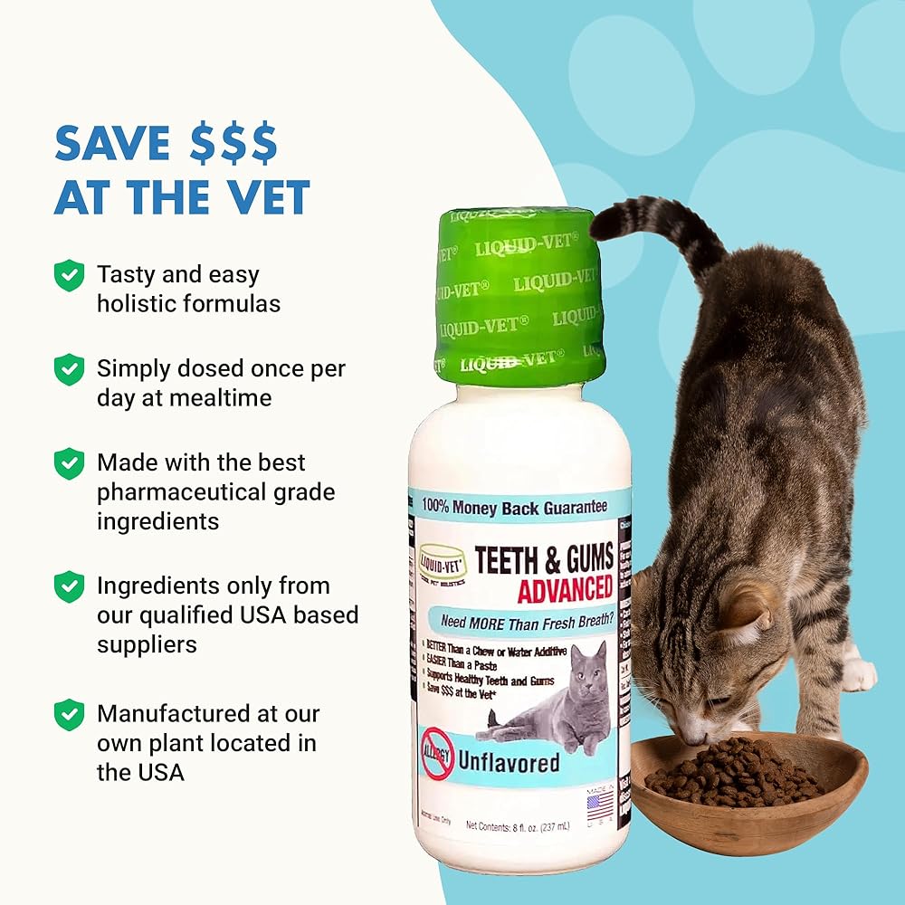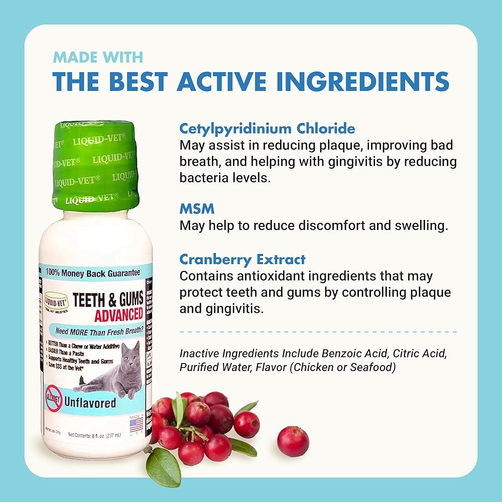 Liquid-Vet Feline Teeth & Gums Advanced Formulas are for cats needing MORE than just fresh breath and are BETTER than a chew or water additive and EASIER than a paste. Liquid-Vet Feline Formulas are the only products available in a choice of natural flavors for picky pets or those pets that may have allergies to specific proteins. Simply dose during meal time once a day with no mixing required. It's that easy! Plus, Liquid-Vet Feline Teeth & Gums Advanced Formulas are in 2 WEEKS or YOUR MONEY BACK! And how about safety? Liquid-Vet is manufactured at our own plant located in the USA, using materials only from our qualified USA based suppliers. Active Ingredients (Per 2 Tsp): 177 mg Dental-Vet – A proprietary blend of MSM, Cranberry Extract, & Cetylpyridinium Chloride Directions for Use: For cats 10 lbs. and under, dose 1 1/2 tsp. For cat's 10 lbs. and over, dose 2 tsp. Shake thoroughly and then dose the recommended daily oral dosage during mealtime. For max freshness, refrigerate after use and use the recommended dose daily until bottle is empty. Ingredients: MSM, Cranberry Extract, Cetylpyridinium Chloride, Benzoic Acid, Citric Acid, Purified Water, Flavor (Chicken, Seafood, or Bacon)