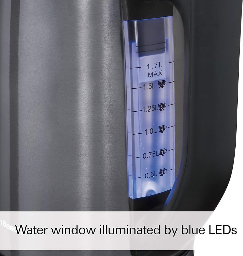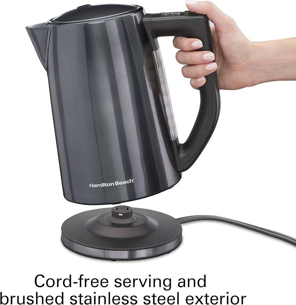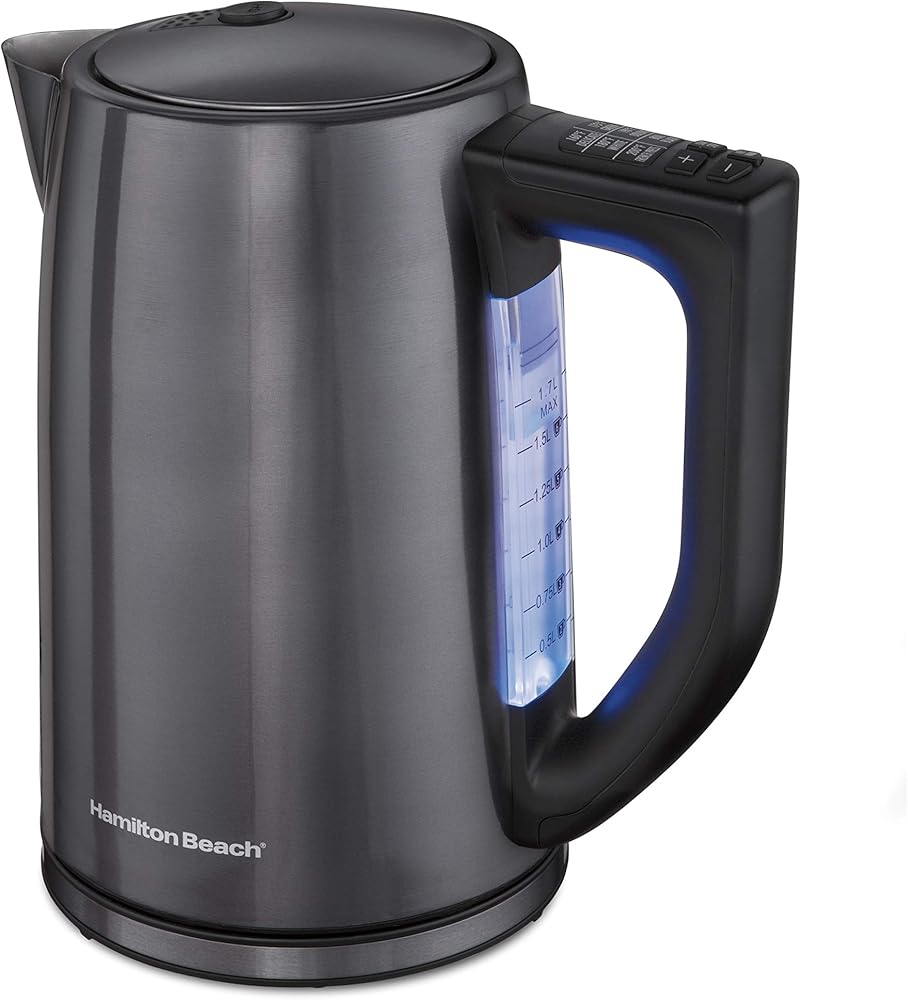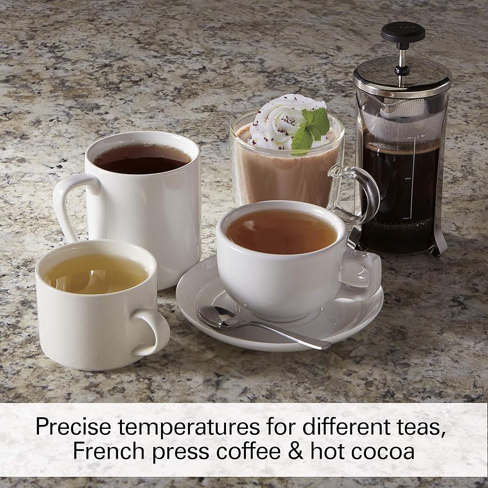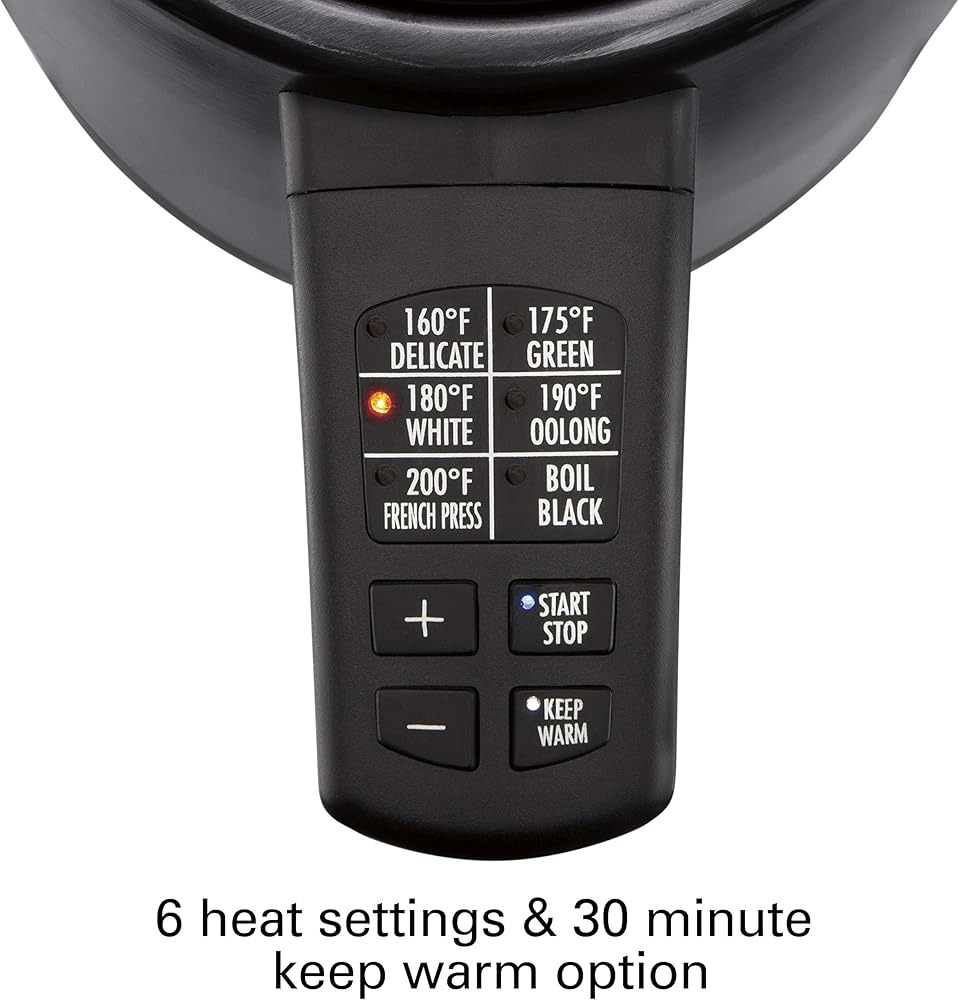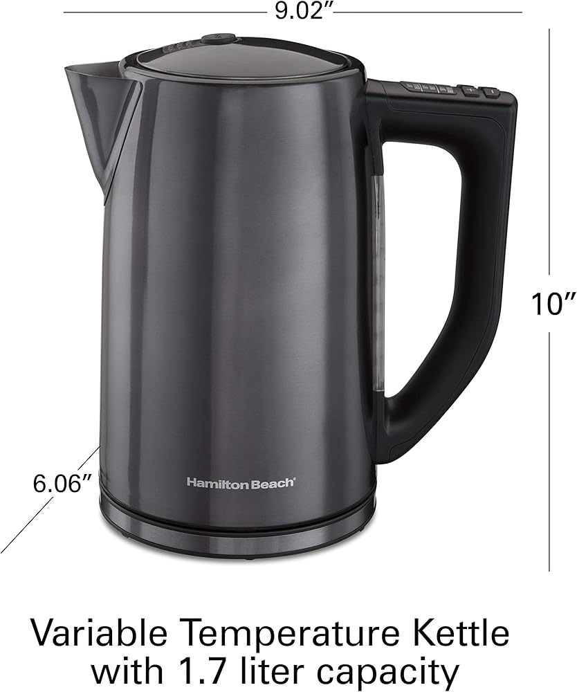 The Hamilton Beach 1. 7 liter Black Stainless Steel, temperature control electric kettle, water boiler & tea heater with LED indicator, auto-shutoff, keep warm & boil-dry protection has six integrated one-touch temperature settings that correspond to the ideal temperature for a variety of teas, plus French press Coffee. More smart features make it easy to fill, serve and clean.