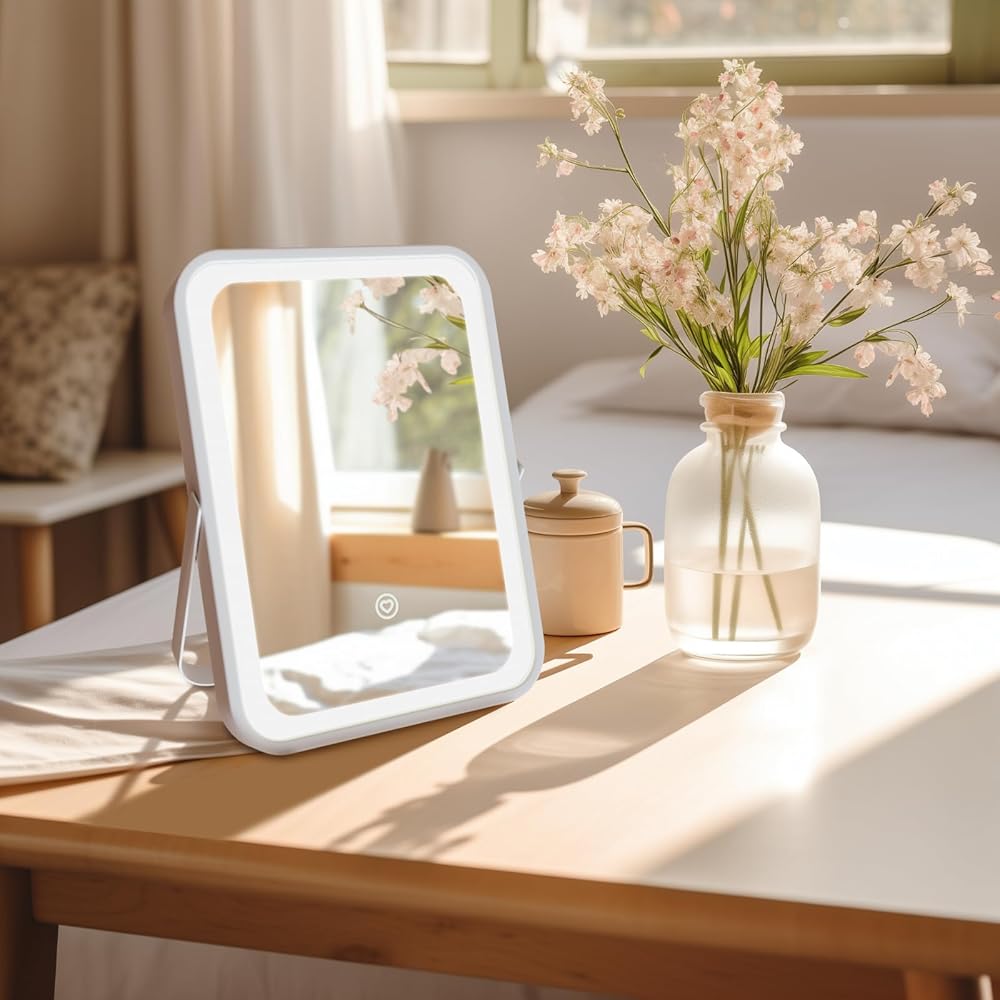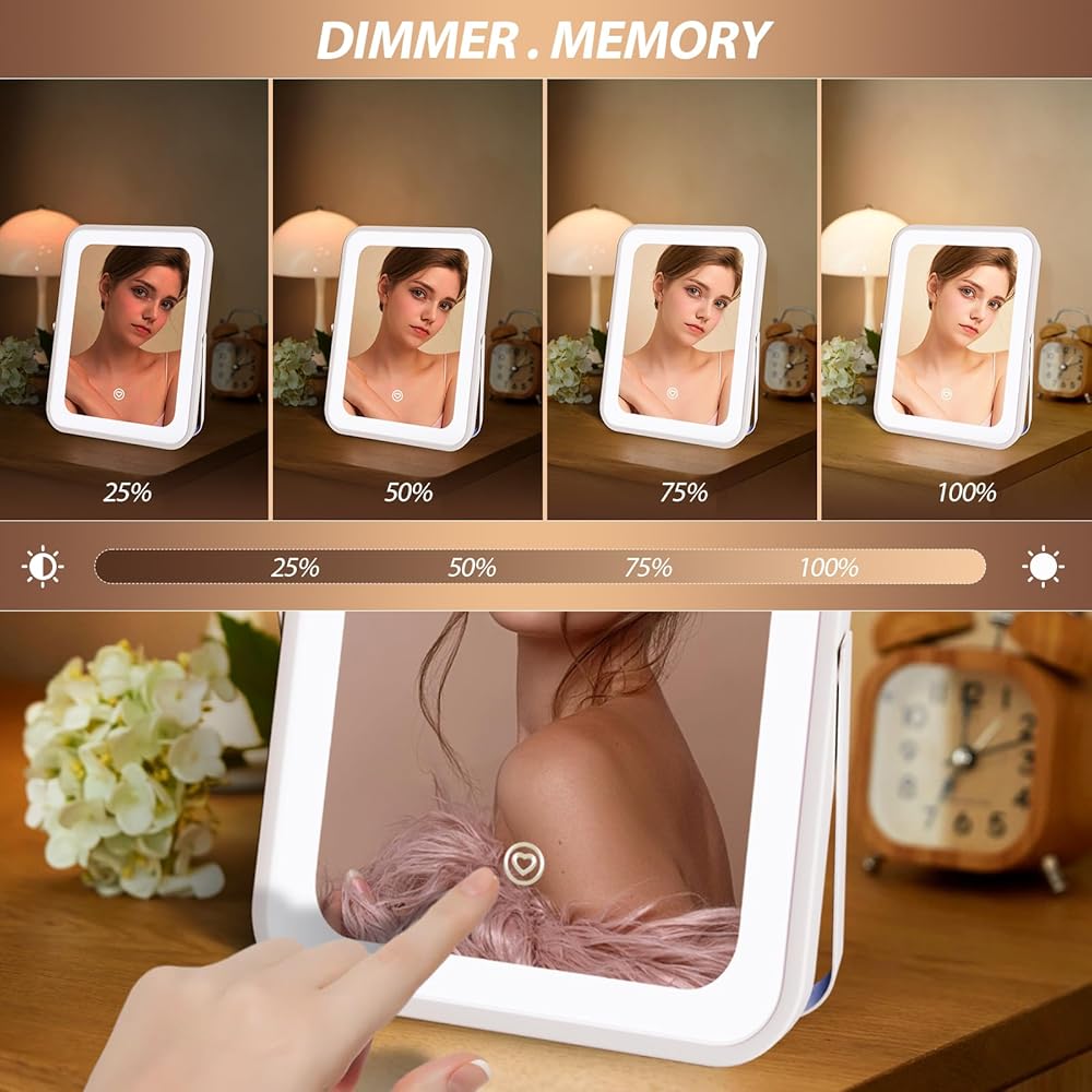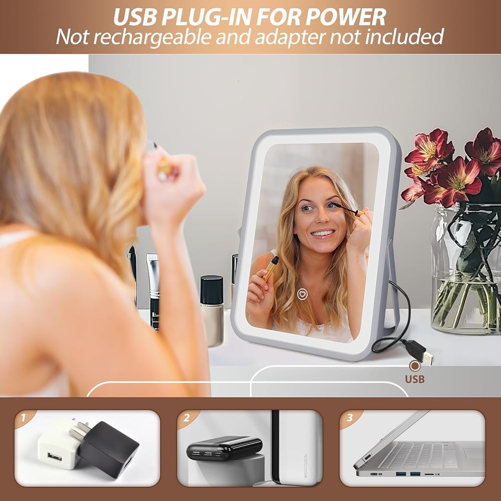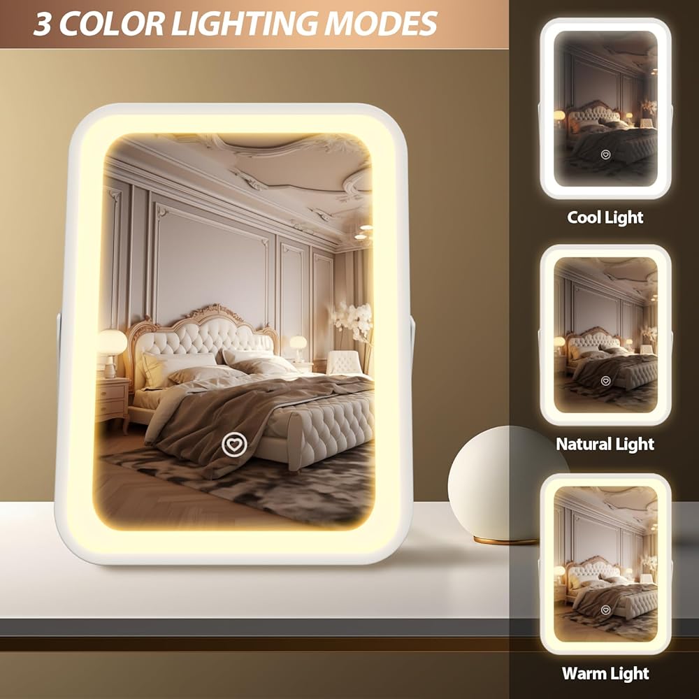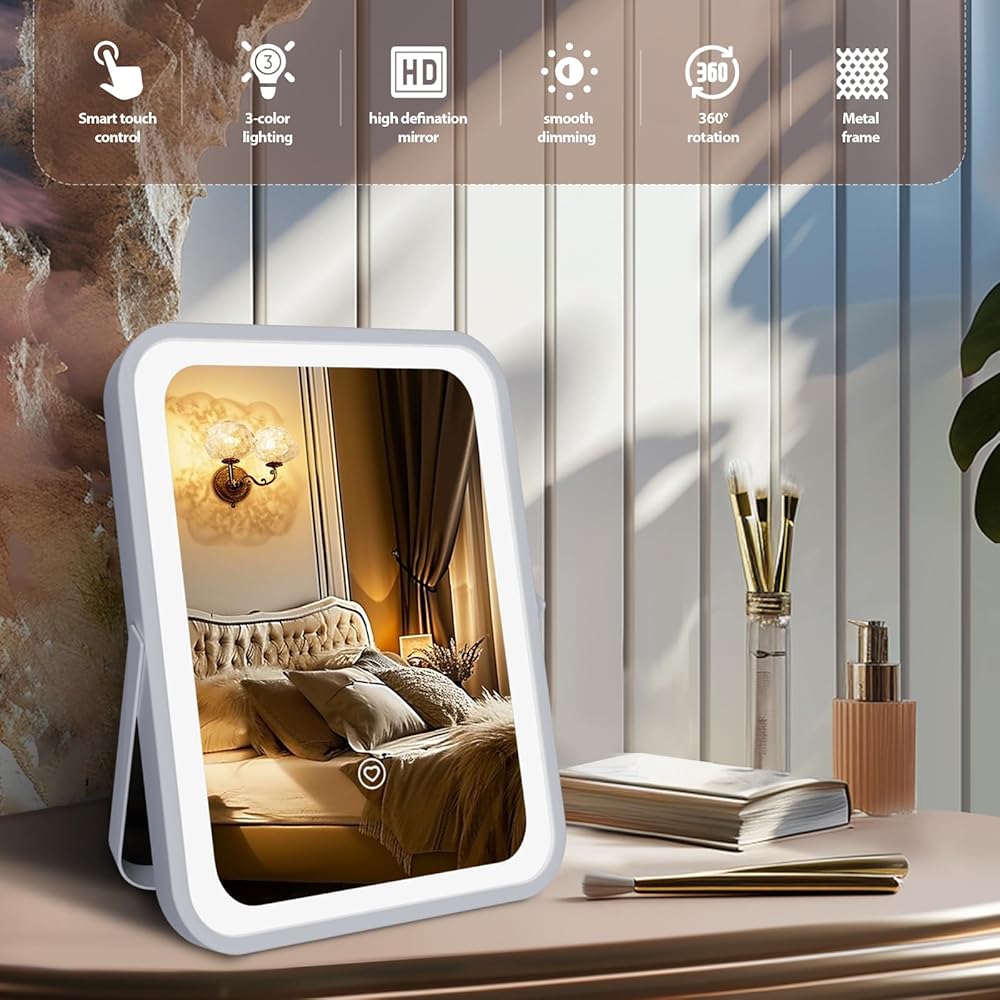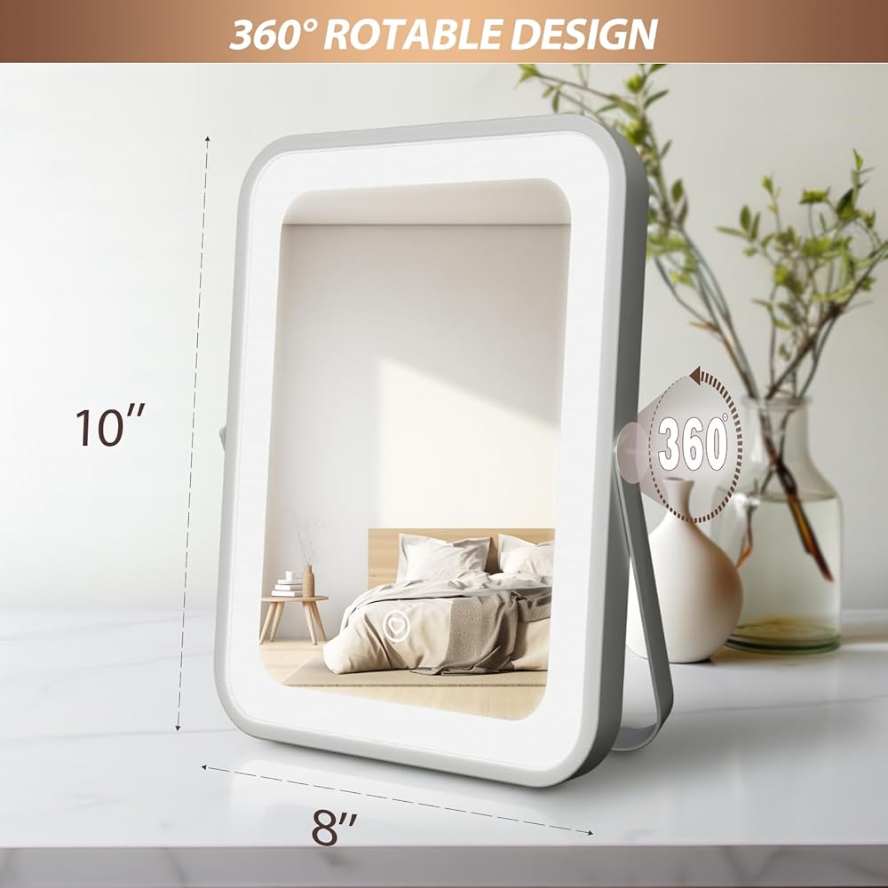مرآة فانيتي مع أضواء - مرآة مكياج مضاءة بإضاءة هوليوود مقاس 8 × 10 بوصة مع 3 ألوان خفيفة، قابلة للتعتيم، تحكم ذكي باللمس، دوران 360 درجة، مرآة مستحضرات تجميل LED محمولة للسفر، هدية للأم لعيد الأم