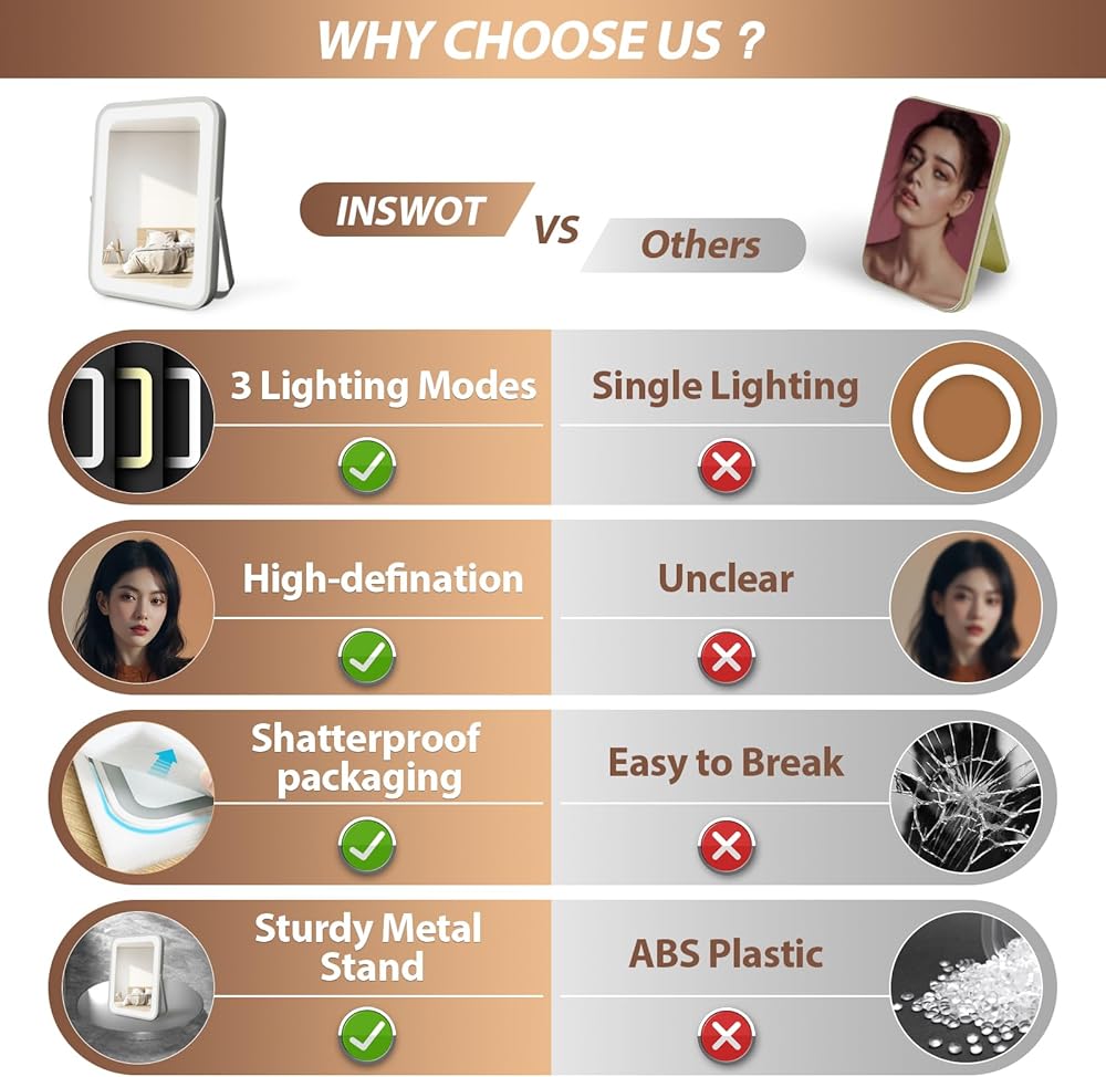 • 💡【3 أوضاع ألوان وسطوع قابل للتعديل】مرآة INSWOT المضيئة مقاس 8 × 10 بوصة شريط إضاءة LED مدمج لحماية العين، توفر ثلاثة أوضاع إضاءة ملونة: الضوء الطبيعي، الضوء الدافئ والضوء البارد. اضغط لفترة طويلة لضبط سطوع الضوء بين 10%-100%. يمكن لمرآة المكياج القابلة للضوء أن تلبي احتياجات المكياج الشخصية المختلفة للمناسبات المختلفة.