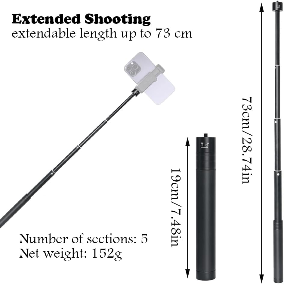 Size: The retractable extension pole has an approximate extension length of 73cm/28.74in and a storage length of 19cm/7.48in.