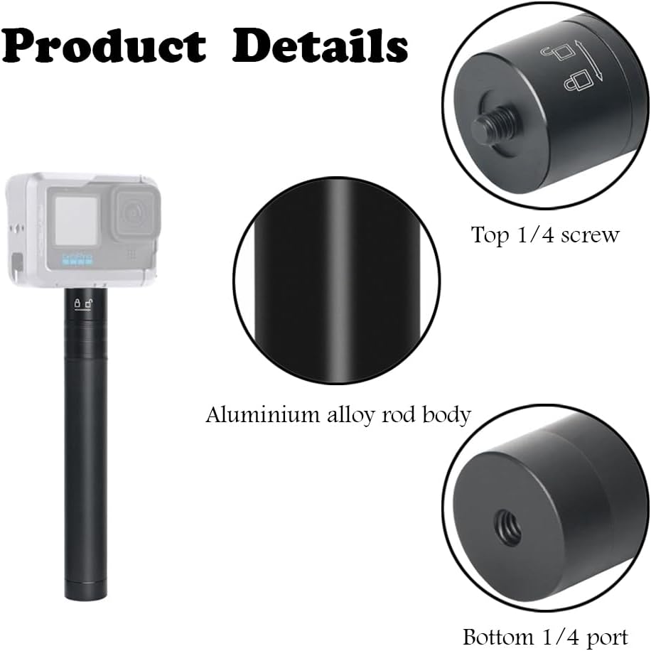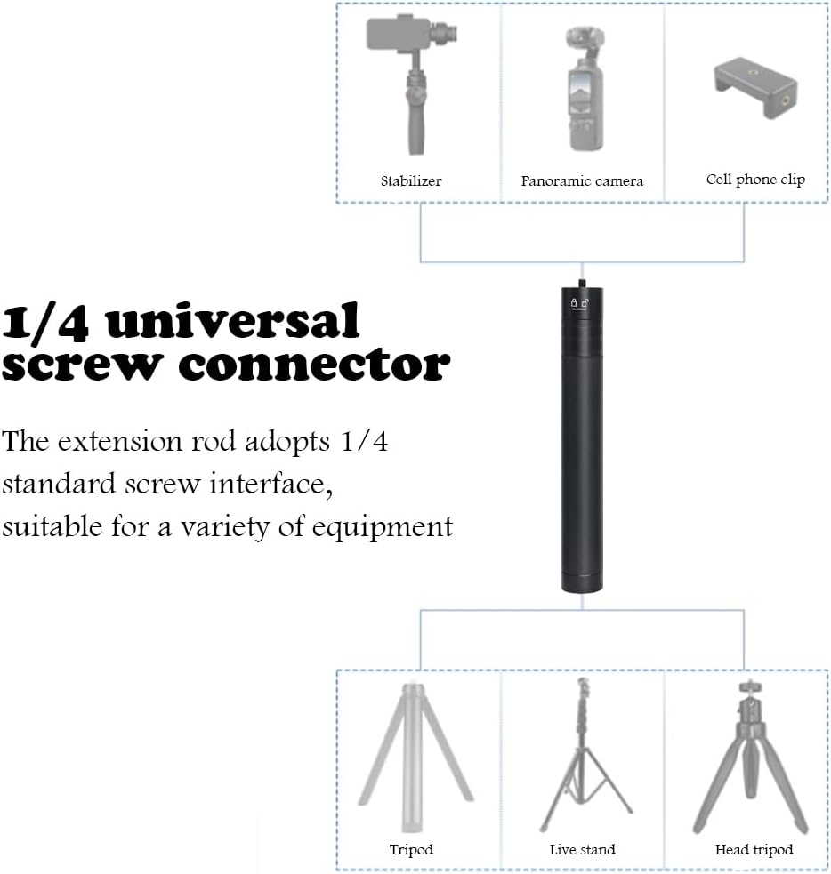 PACKAGE INCLUDES-You will receive an ultra long selfie stick with a 1/4 screw on the top and a 1/4 connector on the bottom in black color!