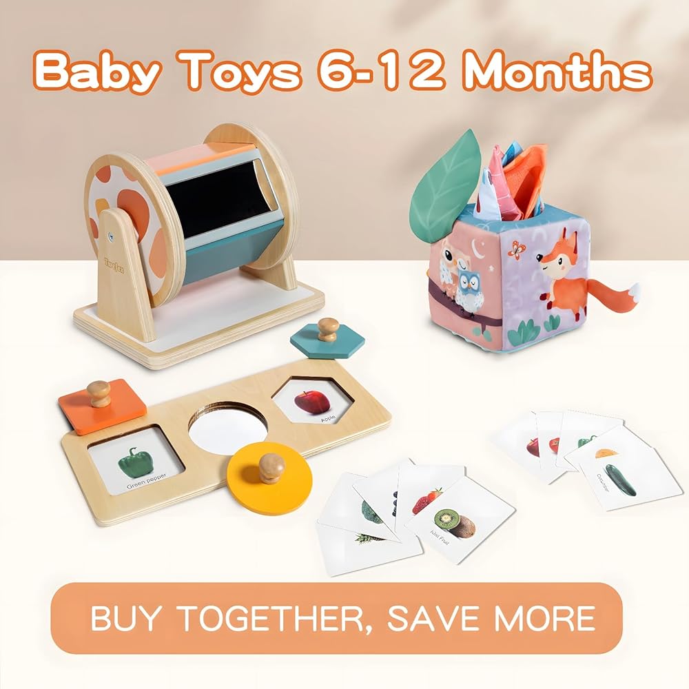 ألعاب مونتيسوري للأطفال من عمر 6 إلى 12 شهرًا - مجموعة ألعاب أطفال 3 في 1 - طبلة دوارة متوسطة - لعبة صندوق مناديل الأطفال - لغز مقبض بيكابو مع بطاقات - لعبة تعليمية تعليمية للأولاد والبنات