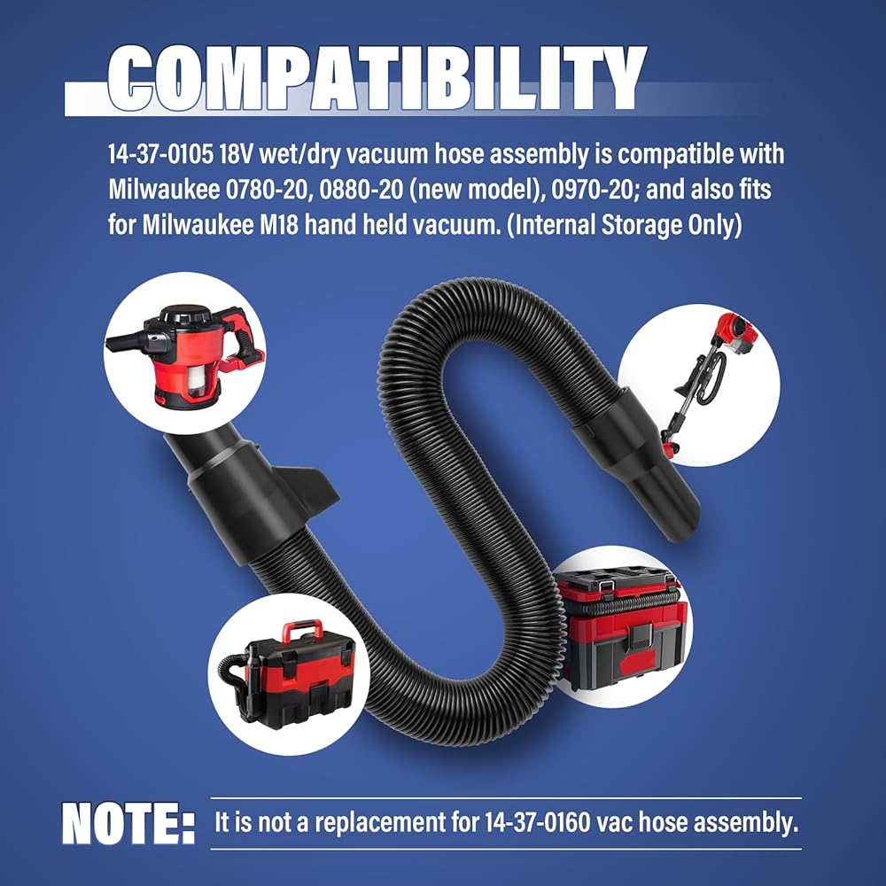 【Compatibility】14-37-0105 18V wet/dry vacuum hose assembly is compatible with Milwaukee 0780-20, 0880-20, 0970-20 (Internal Storage); and also fits for Milwaukee M18 hand held vacuum. Please note, it is not a replacement for 14-37-0160 vac hose assembly.