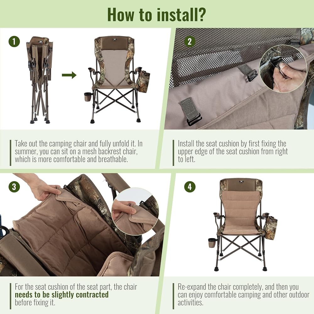 • مواد عالية الجودة: تم تصميم كرسي التخييم الخاص بنا ليدوم طويلاً، مع هيكل فولاذي قوي وخياطة معززة لتحقيق أقصى قدر من المتانة. سواء كنت تتنزه سيرًا على الأقدام أو تصطاد الأسماك أو تسترخي ببساطة بجانب نار المخيم، يمكنك الوثوق في أن كرسينا سيوفر مقعدًا موثوقًا لجميع أنشطتك الخارجية.