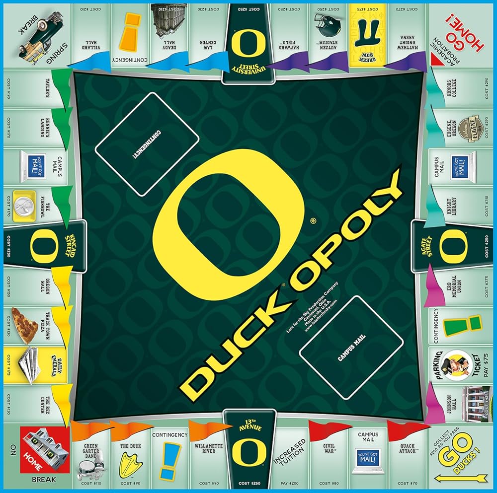 Located in Eugene, Oregon, the University of Oregon is the state's flagship institution. Offering academic excellence, nationally ranked athletics and longstanding traditions, the UO experience is like no other! LOOKING FOR A FUN WAY TO EXPERIENCE THE UNIVERSITY OF OREGON? HERE IT IS! ALL THE FUN…NONE OF THE STUDYING! Choose your token and advance to GO DUCKS! Collect years of credit and trade them in for diplomas. You may soon be marching in the Green Garter Band...or bumming quarters to do your laundry!