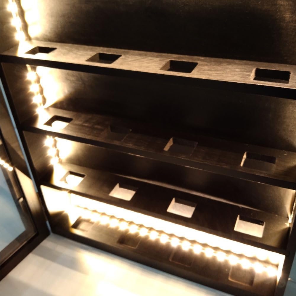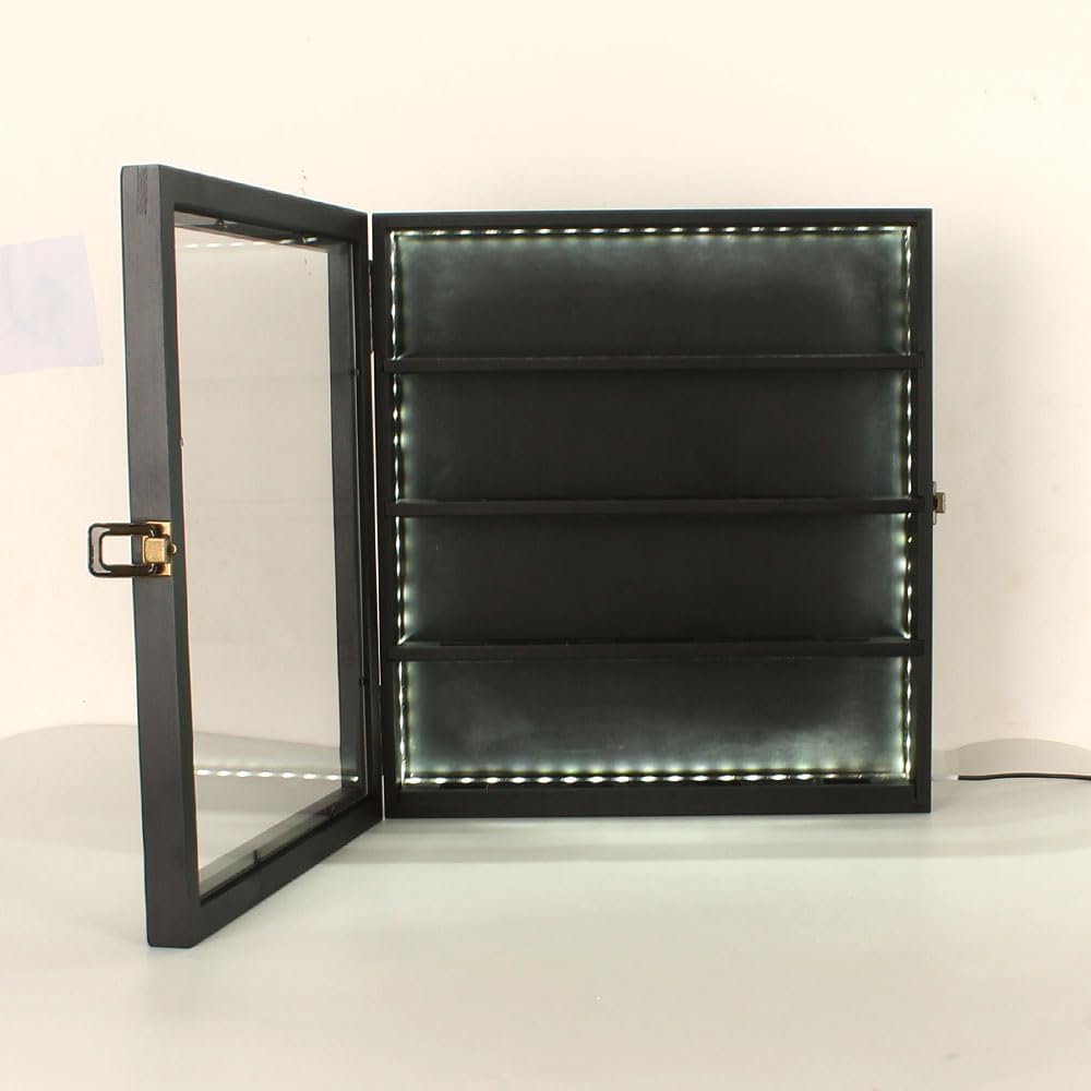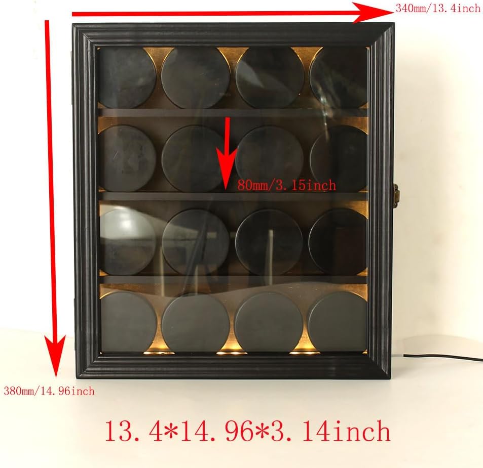 Material: wood, acrylic, security lock, lighted strip (batteries not supplied, Hockey not included). Size:15*13.4*2.8 inches Colour: black. Can be hung on the wall for better display and collection, a gift for sports fans and collectors.puck display case available in three tiers, the tiers can be moved.