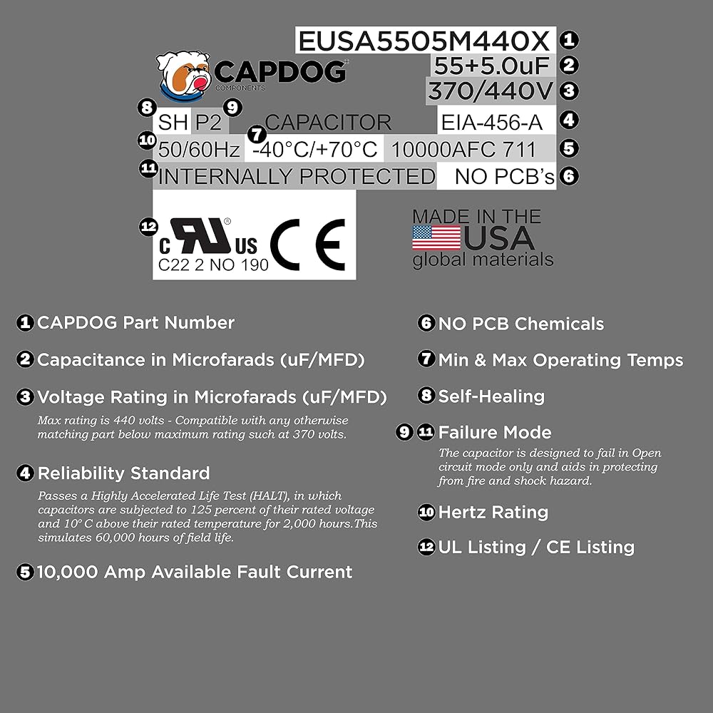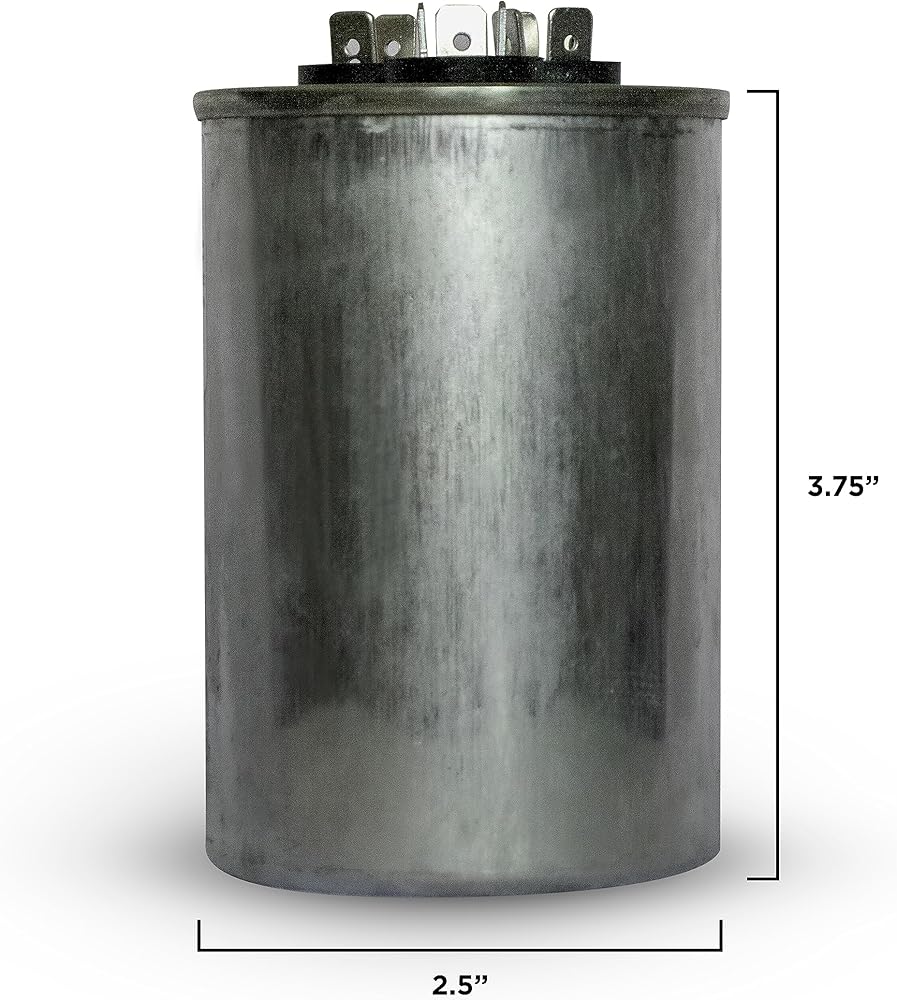 Capacitance: 55/5 uF (MFD) / microfarad Voltage Rating: 440 Volts AC Operating Temperature: -40° to 158°F / -40° to +70°C Operating Frequency 50/60hz ¼” Quick-Connect Terminals. Case Size: 2.5 inches diameter x 3.75 inches height (2.5” D x 3.75” L) Rugged non-polarized oil-filled metallized polypropylene film capacitors.