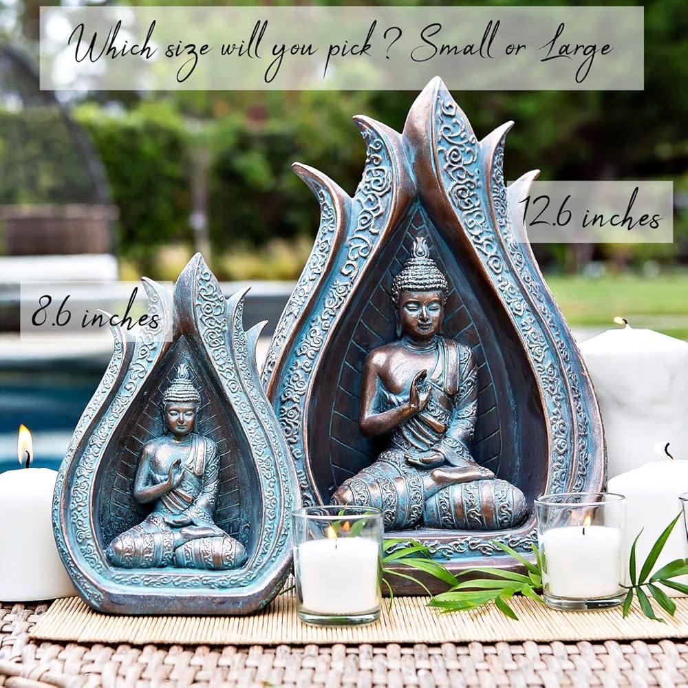 الحجم والوزن - يبلغ طول هذه القطعة من الديكور الروحي 12.6 سم وعرضها 9 سم. يزن 2.2 كجم، ويمكن وضعه بسهولة كجزء من أي ديكور منزلي أو ديكور مكتب أو حتى ديكور غرفة نوم بوهو روحي. ضعه في زاوية، أو كجزء من مذبح بوذي، لأن بوذا هذا ثابت ويعيش في سلام في أي مكان.