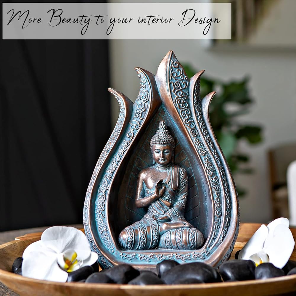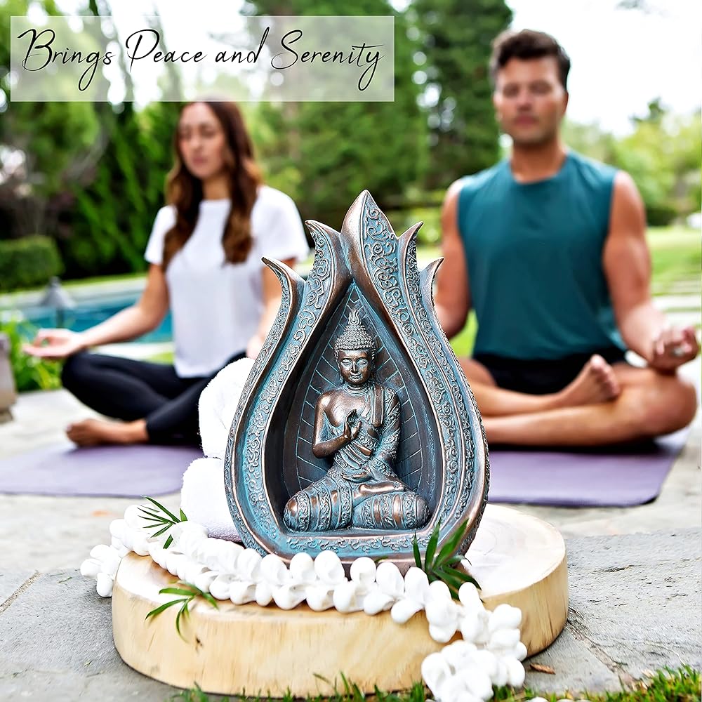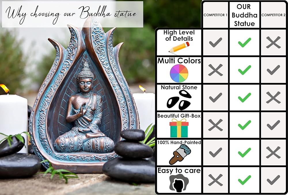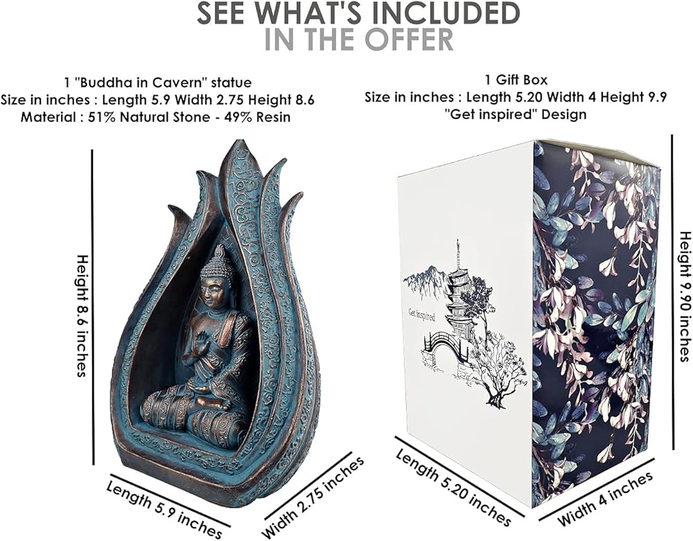 مصنوع يدويًا من الحجر - يستغرق إنشاء كل بوذا في مجموعتنا ما يصل إلى 60 يومًا. تم تشكيل الحجر الصلب والراتنج يدويًا لإنتاج تمثال خفيف الوزن ولكنه قوي. تم نحت كل واحدة يدويًا لإنتاج التفاصيل الدقيقة، ثم تم رسمها يدويًا بواسطة فريق من الحرفيين المتخصصين على مدار أسبوعين لضمان خلو كل طبقة ولون ولمسة نهائية من اللطخات، وتم تشطيبها لتبدو وكأنها تمثال برونزي.