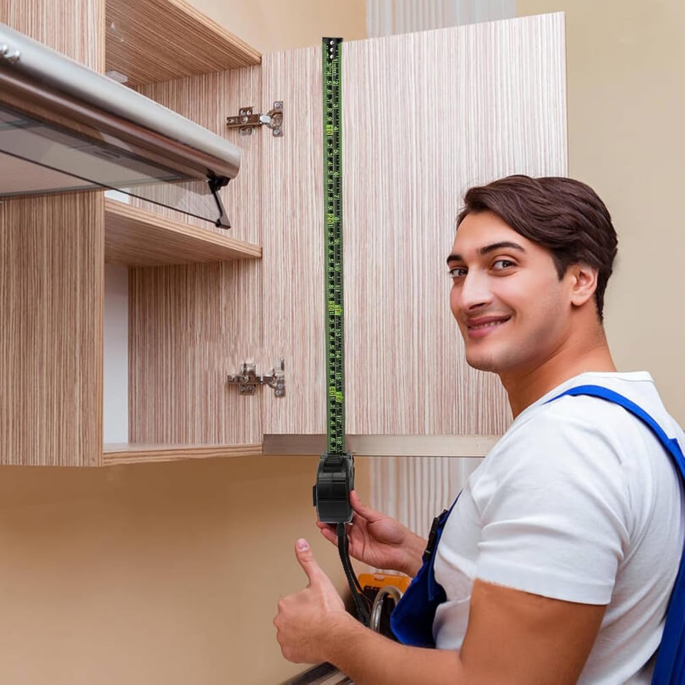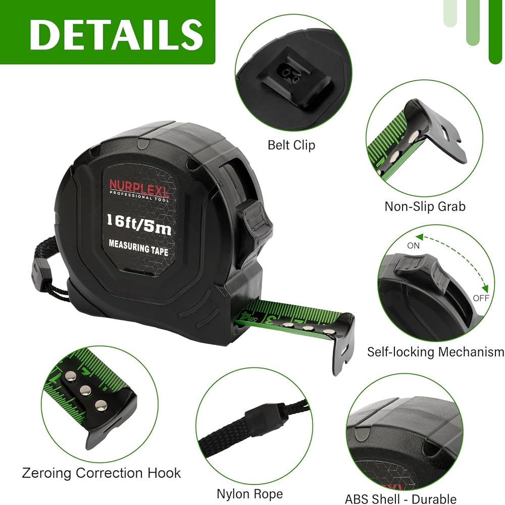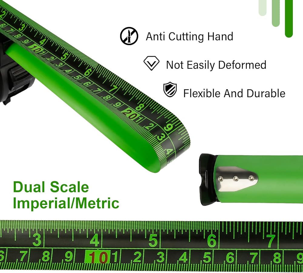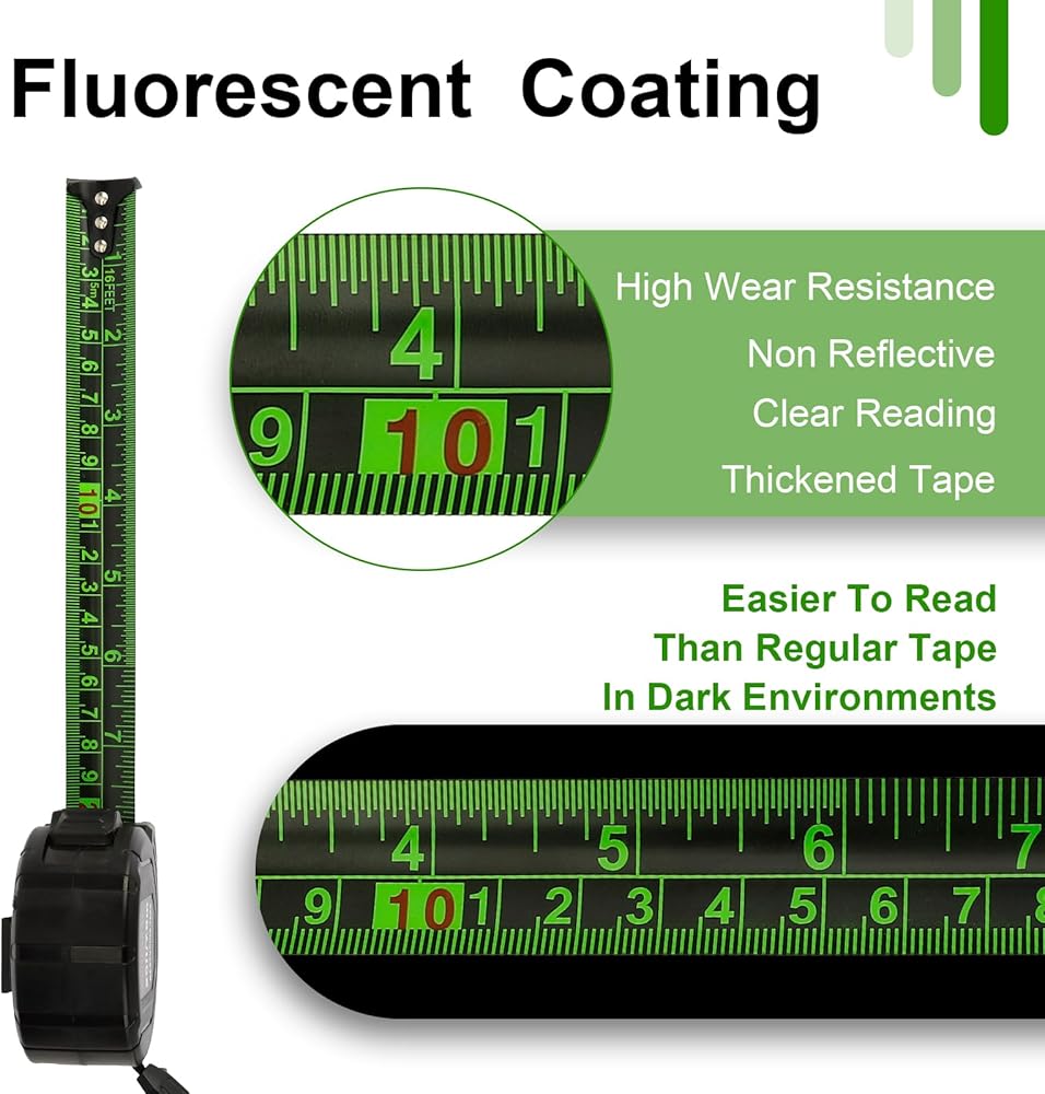 EASY TO READ: The blade of this 16 ft measuring tape is 1in width and is made of high-quality thickened steel and coated with a wear-resistant and fluorescent coating and the green Bold & Large Numbers, clear handwriting, it makes the ruler have better reading performance and longer life
