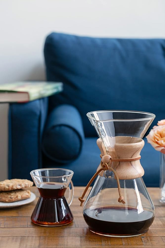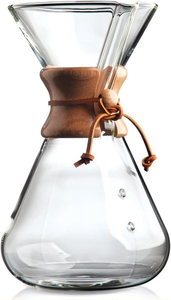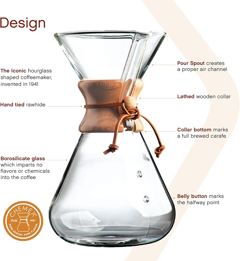 جميع ماكينات تحضير القهوة من CHEMEX مصنوعة من زجاج بوروسيليكات عالي الجودة وغير مسامي والذي لن يمتص الروائح أو المخلفات الكيميائية. يتم إنتاج هذه القطع بكميات صغيرة بواسطة منافيخ زجاجية حرفية، ويتم تشكيل هذه القطع باستخدام الزجاج الكرواتي.
