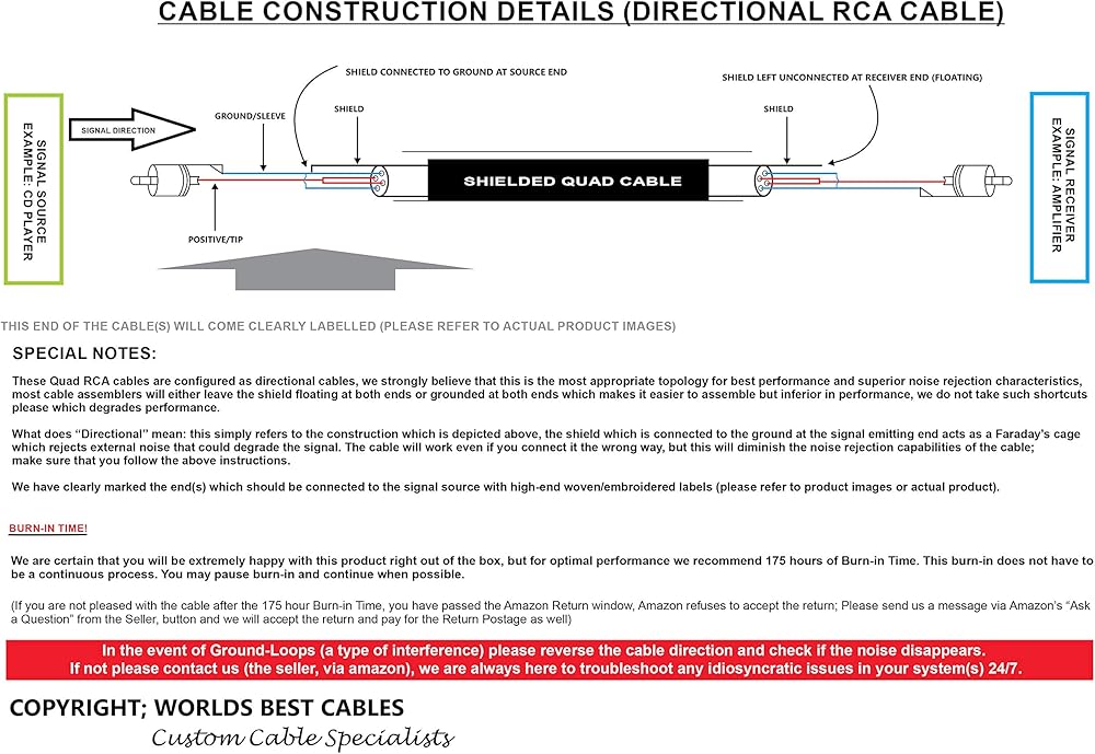 هذا البيع لزوج من الكابلات "الاتجاهية"، يبلغ طول كل كابل 3.5 قدم (كابلان للقنوات اليسرى واليمنى). يرجى الرجوع إلى الصور للحصول على المواصفات التفصيلية حول الموصلات والكابل وتعليمات التوصيل ومخطط البناء.