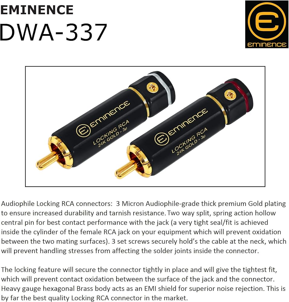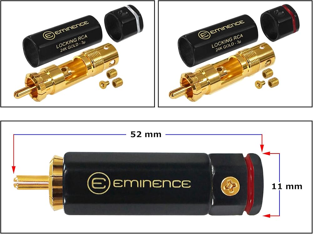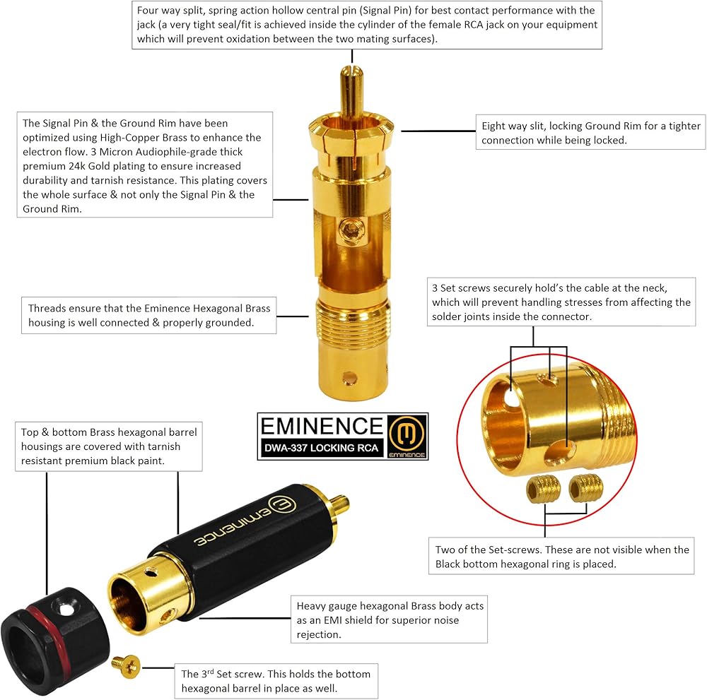 موصلات RCA بقفل Audiophile: طلاء ذهبي بسمك 3 ميكرون لضمان زيادة المتانة ومقاومة التشويه. دبوس مركزي مجوف مقسم بأربعة اتجاهات، مزود بحركة زنبركية للحصول على أفضل أداء للاتصال. 3 براغي لتثبيت الكابل بشكل آمن في الرقبة.