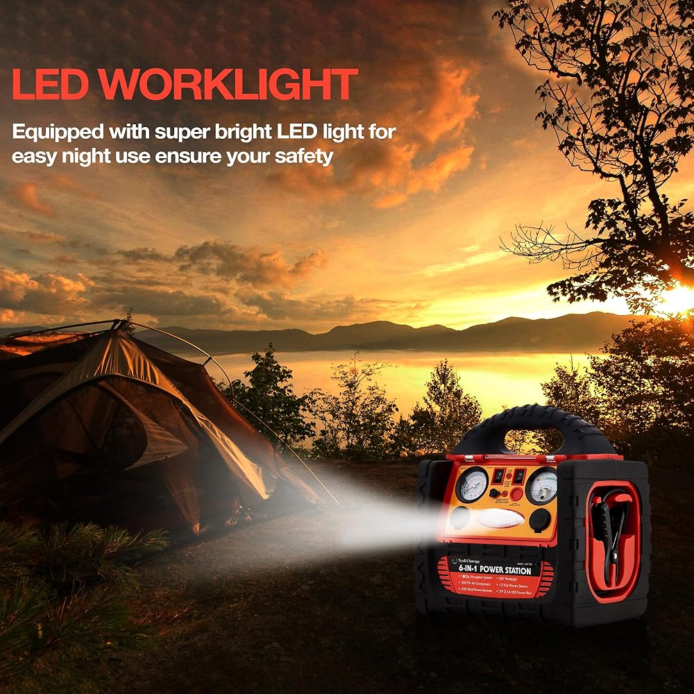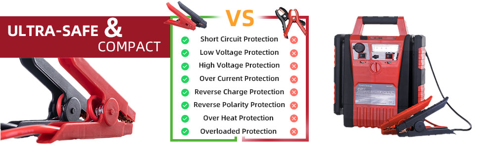 【صندوق القفز لبطارية السيارة】تيار الذروة 1700 أمبير لبدء تشغيل معظم المركبات 12 فولت على الطريق، مثل السيارة، وسيارات الدفع الرباعي، وسيارات العمل، والشاحنات، والالتقاط، والسيارات الكهربائية، وجزازة العشب، والشاحنات الصغيرة، والدراجات النارية. بادئ تشغيل السيارة محمول مع 6 AWG وصلة للخدمة الشاقة، مجهزة بمشابك فكية ساخنة من الدرجة الصناعية، ومؤشر قطبية عكسية وإنذار.