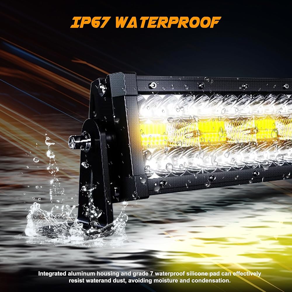 • وظيفة الذاكرة - سيتذكر شريط الضوء للطرق الوعرة الوضع وسيقوم بتشغيل نفس الوضع في المرة القادمة. تأتي مع مجموعة تسخير الأسلاك. تتمتع المصابيح الكهرمانية باختراق قوي، وهي رائعة كضوء تحذير أو مصابيح ضباب أو غيرها من حالات الرؤية المنخفضة. يمكن استخدام الضوء الأبيض كمصابيح قيادة أو مصابيح عمل.