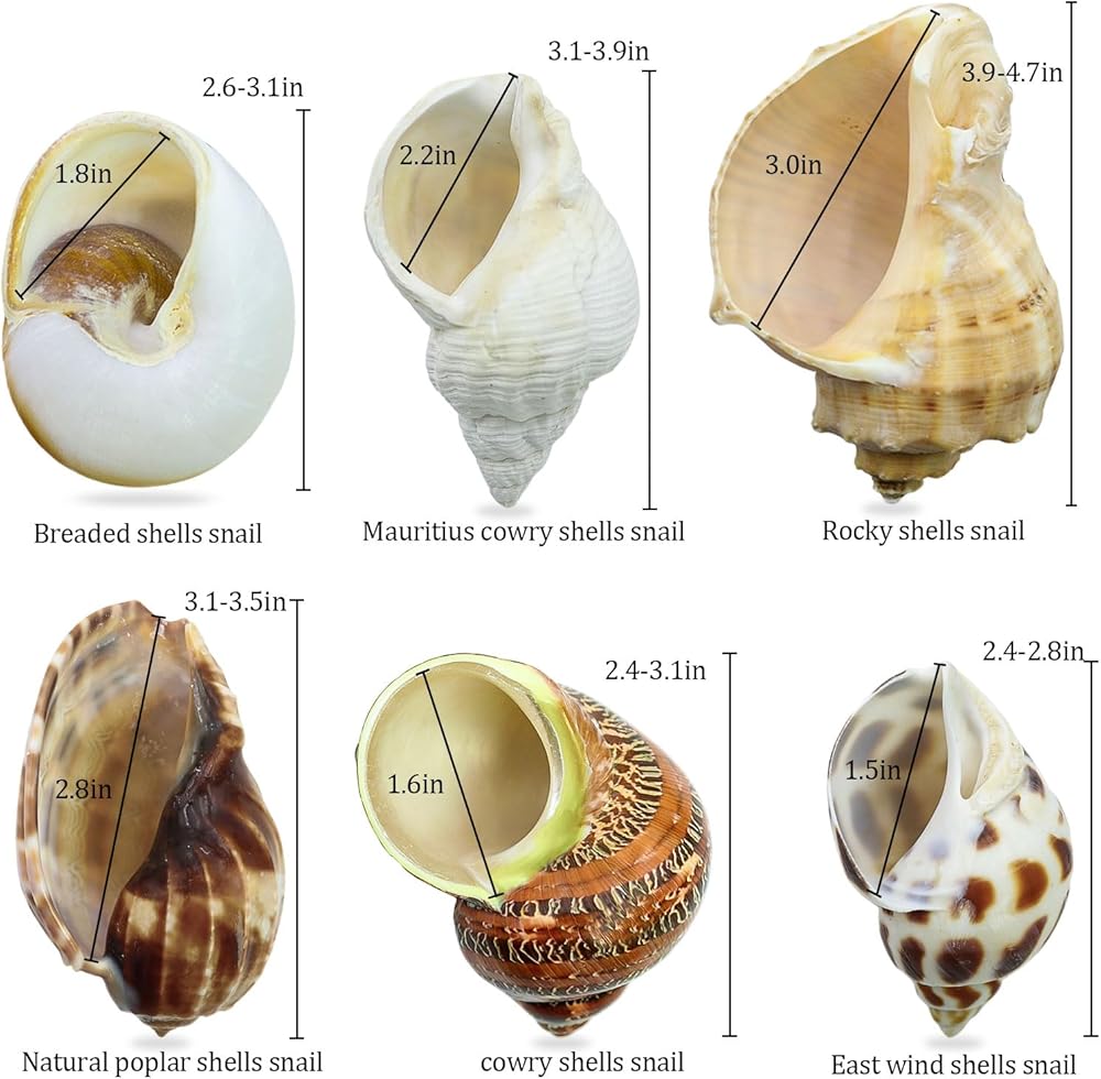 6 قطع من الأصداف الصغيرة والمتوسطة: تتضمن عبوتنا ستة أغطية سرطان البحر الناسك عالية الجودة مع محارات يتراوح مقاسها من 2.4 إلى 4.7 بوصة وفتحات بمقاس 1.2 إلى 2.8 بوصة. تم اختيار الأصداف بعناية وهي مخصصة لتوفير منزل آمن ومريح لسرطان البحر الناسك الخاص بك