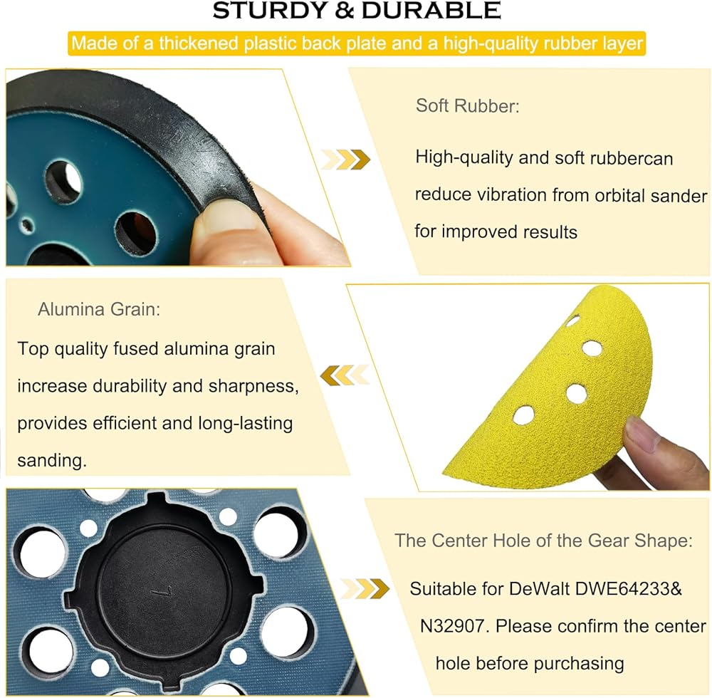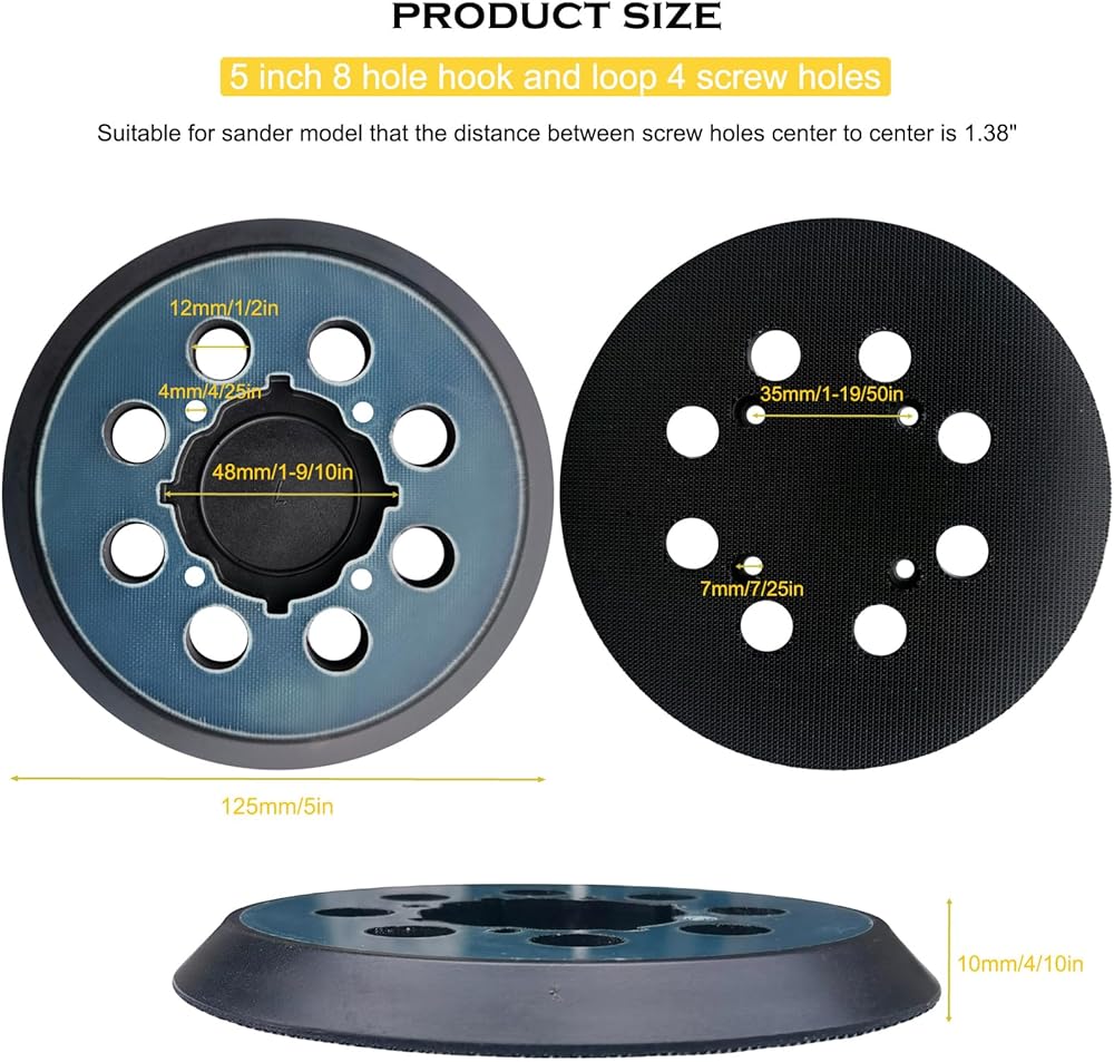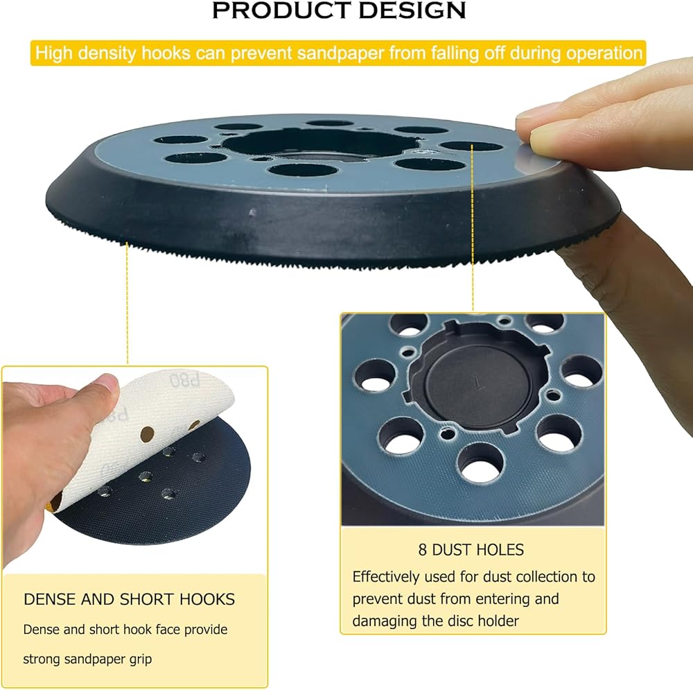 • 5 inch orbital sander pad is made of engineering plastics and high quality soft rubber for more long lifetime. The engineering plastics are hard to be damaged, and the soft rubber can can reduce vibration from orbital sander for improved results