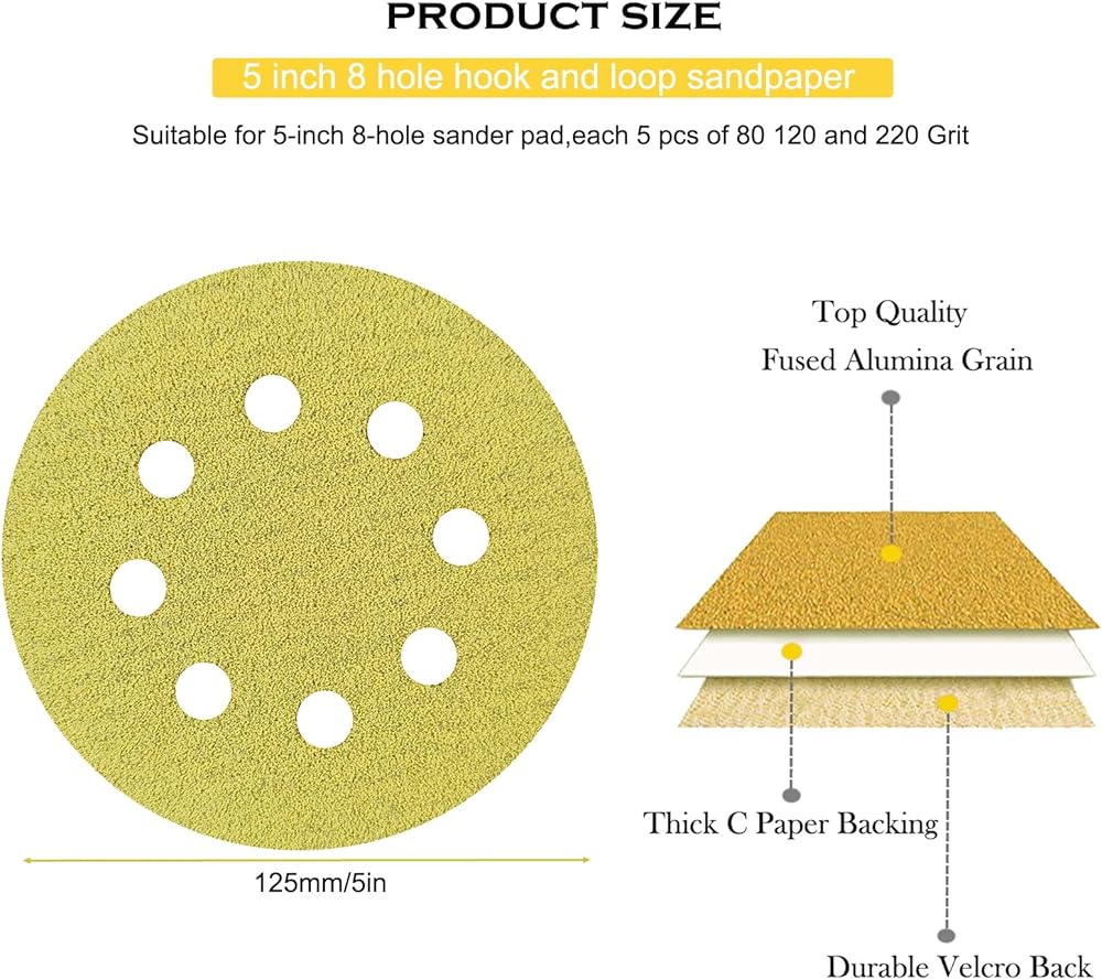 • Total 15 PCS -5" 8 Hole Pattern Sanding Discs with a Hook & Loop Backing. Pack includes 5 discs each of 3 different sanding grits: 80, 120, 220, Grit. The 8 hole pattern allows dustless sanding when attached to a 8 hole backing plate.